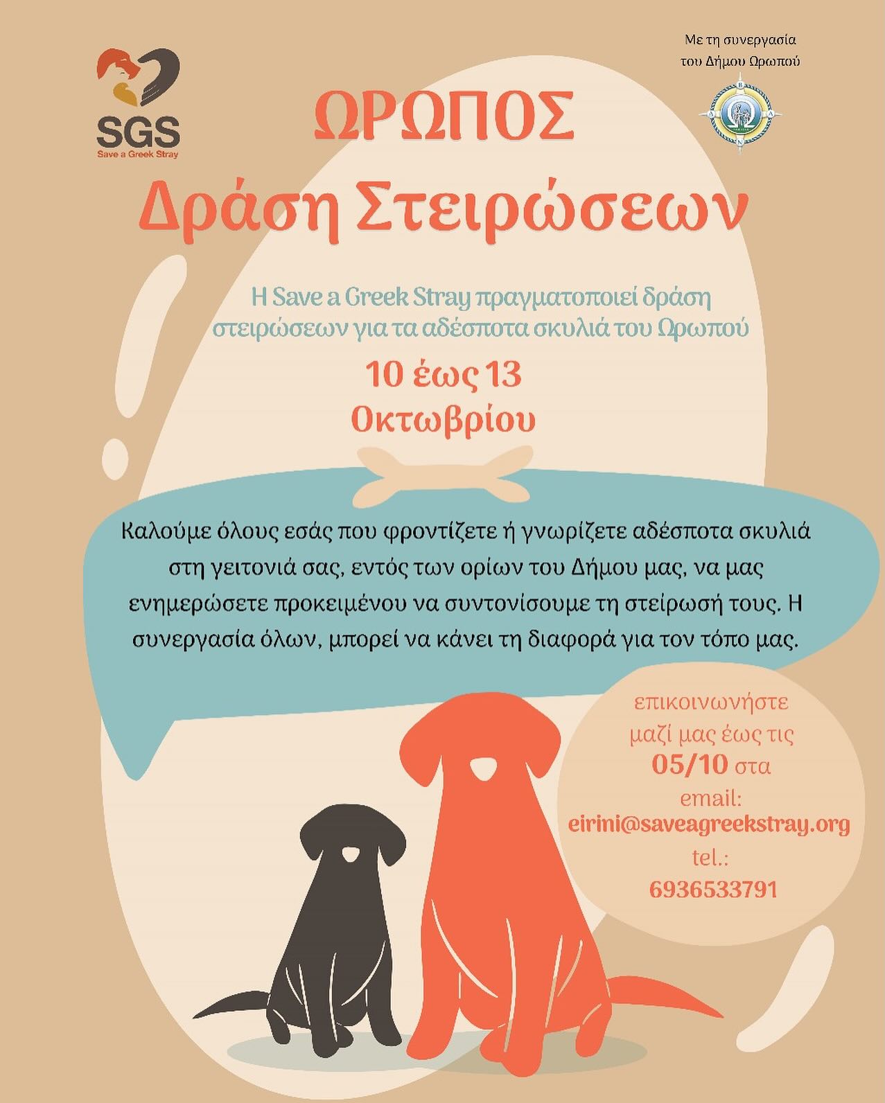 - Στον Δήμο Ωρωπού, από τις 10 έως τις 13 Οκτωβρίου, διεξάγεται δράση στειρώσεων αδέσποτων σκυλιών από την οργάνωση Save a Greek Stray.