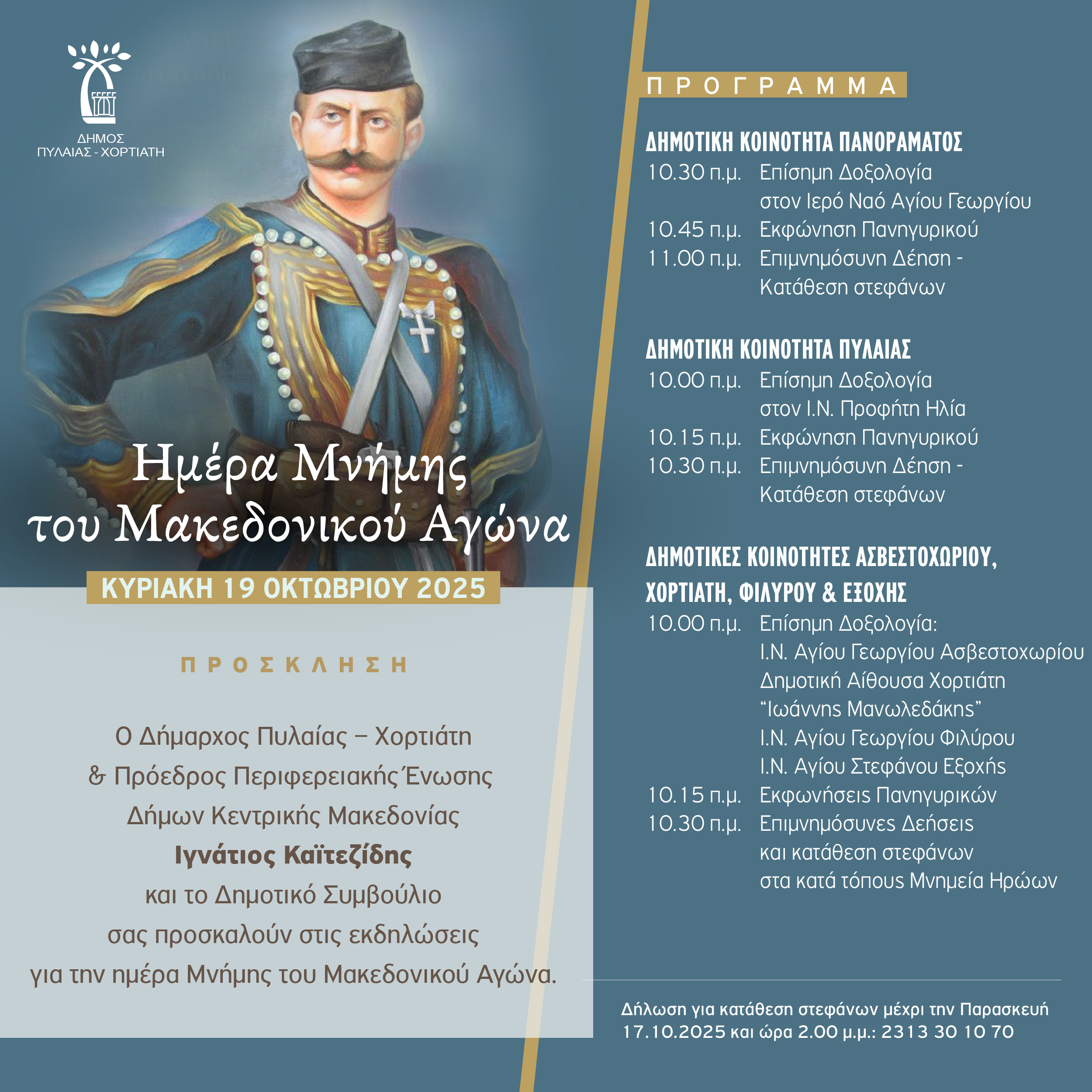 • Ο Δήμος Πυλαίας – Χορτιάτη θα τιμήσει την Ημέρα Μνήμης του Μακεδονικού Αγώνα με εκδηλώσεις στις 19 Οκτωβρίου.
