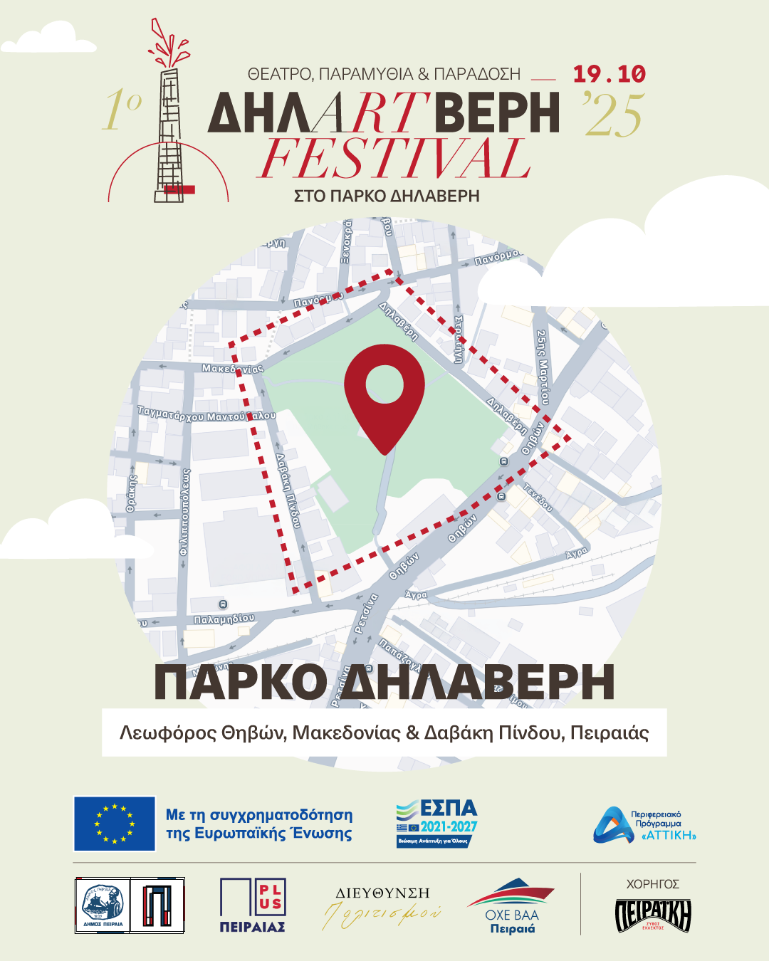 - Το φεστιβάλ ΔΗΛΑRTΒΕΡΗ θα πραγματοποιηθεί για πρώτη φορά στις 19 Οκτωβρίου 2025 στο πάρκο Δηλαβέρη στον Πειραιά, με ελεύθερη είσοδο.