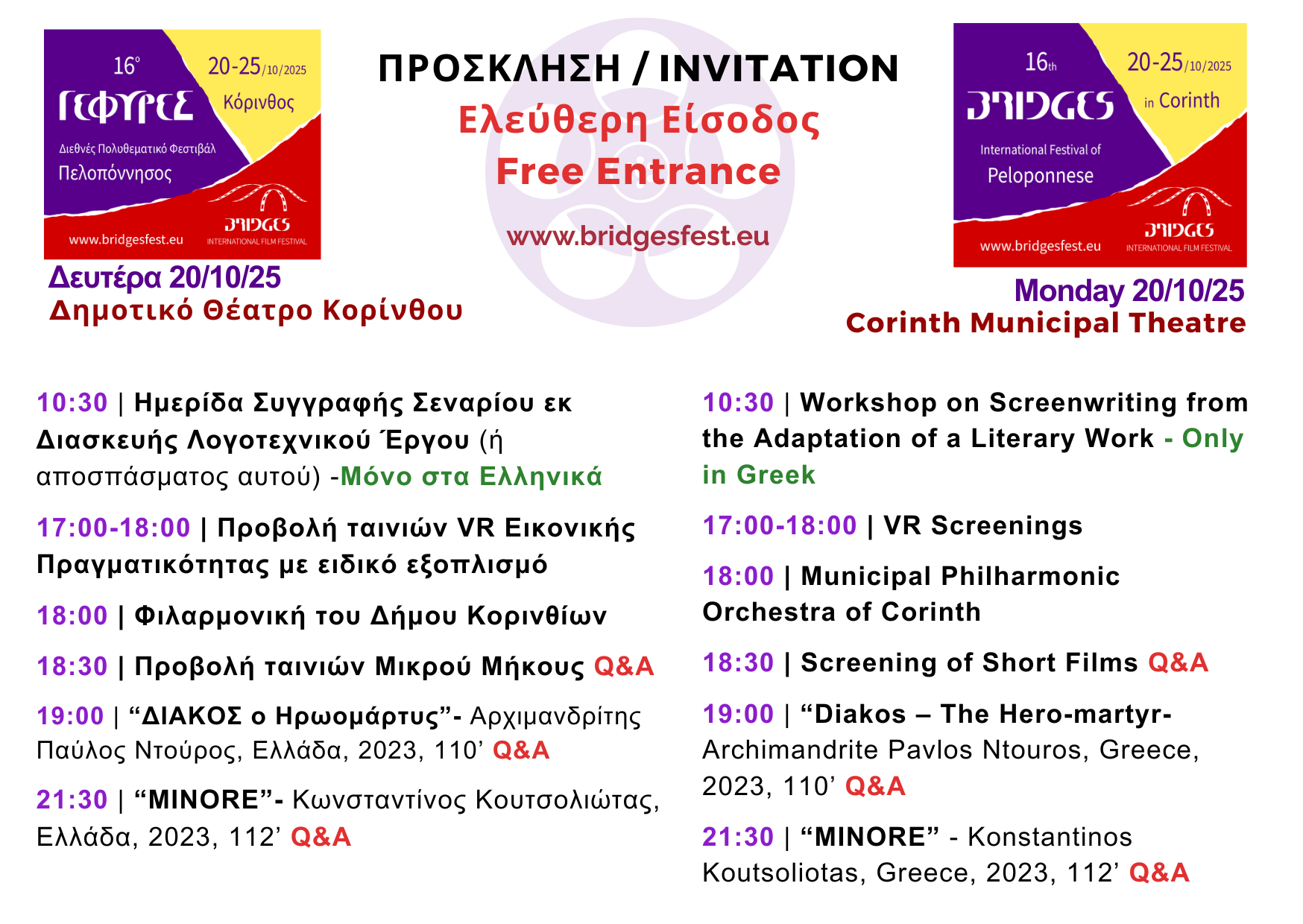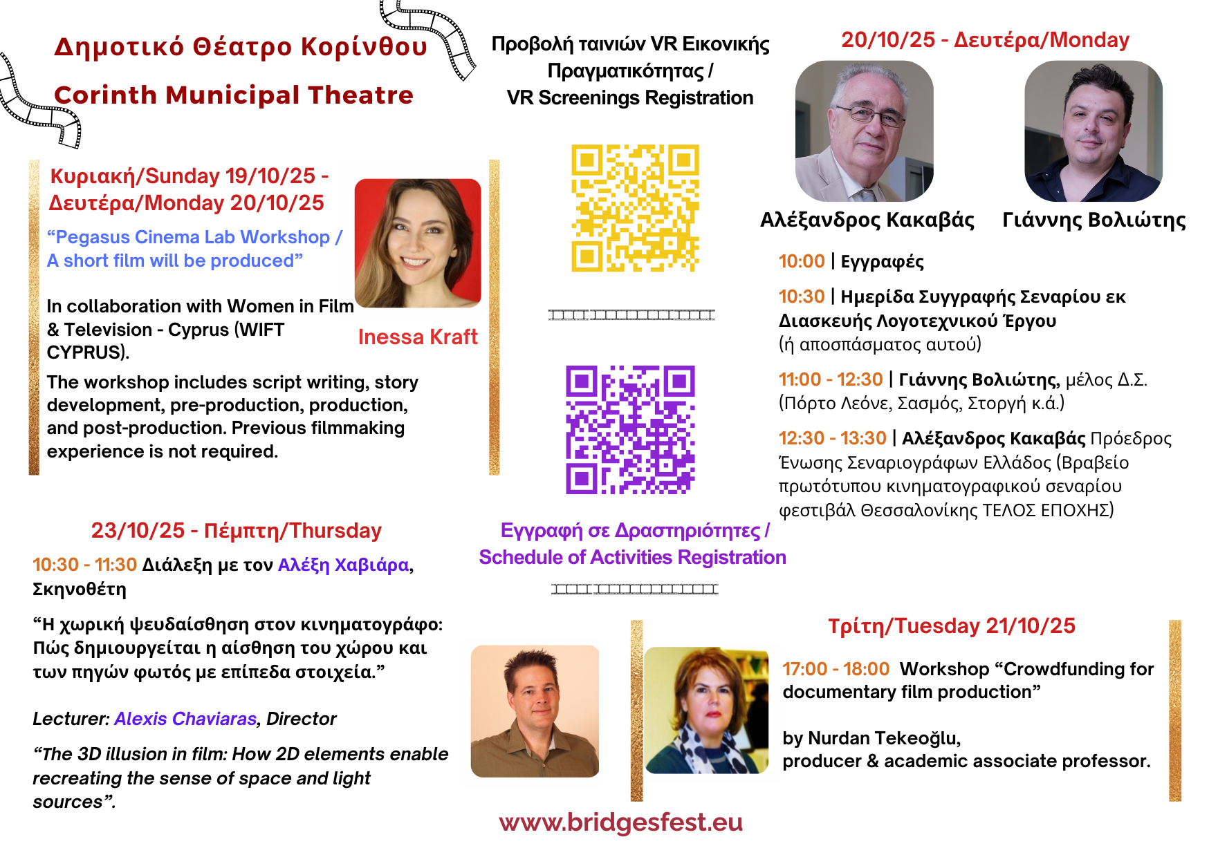 - Το 16ο Παγκόσμιο Πολυθεματικό Φεστιβάλ «ΓΕΦΥΡΕΣ» θα διεξαχθεί από 20 έως 25 Οκτωβρίου 2025 στον Δήμο Κορινθίων με ελεύθερη είσοδο.