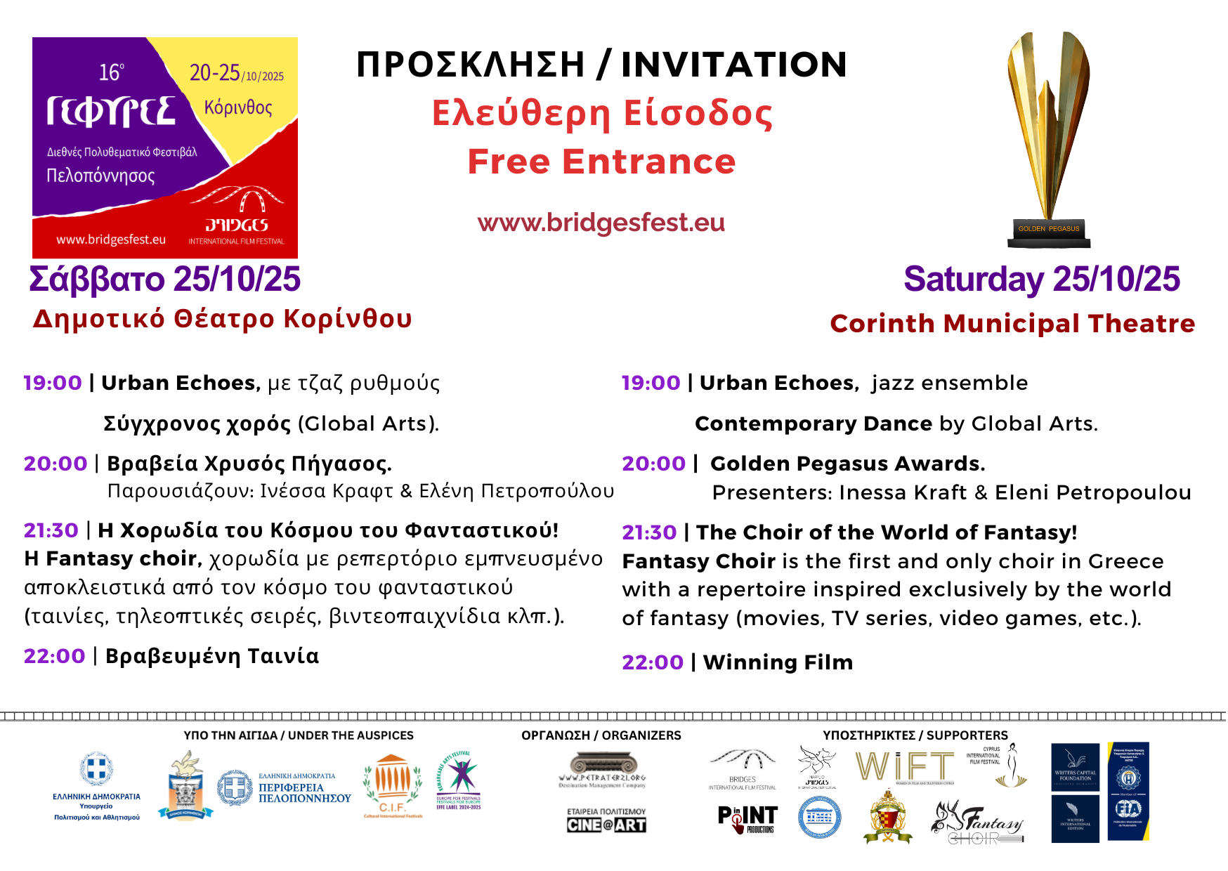 Ο Πήγασος – σύμβολο της πόλης της Κορίνθου – στην αρχαιότητα θεωρήθηκε το άλογο των Μουσών που ιππεύουν οι ποιητές και πετάνε ψηλά στο καλλιτεχνικό στερέωμα. Γι’ αυτό το λόγο το μεγάλο βραβείο του Φεστιβάλ “ΓΕΦΥΡΕΣ”, ο “ΧΡΥΣΟΣ ΠΗΓΑΣΟΣ” απονέμεται σε ταινία που διακρίνεται από τη VIP διεθνή κριτική επιτροπή μέσα από επίσημη επιλογή ταινιών μεγάλου μήκους, υψηλού καλλιτεχνικού επιπέδου, που θα «ταξιδέψουν» και θα προβληθούν σε άλλα φεστιβάλ, προβάλλοντάς την Ελληνική διοργάνωση και μετά το πέρας του Φεστιβάλ “ΓΕΦΥΡΕΣ”.