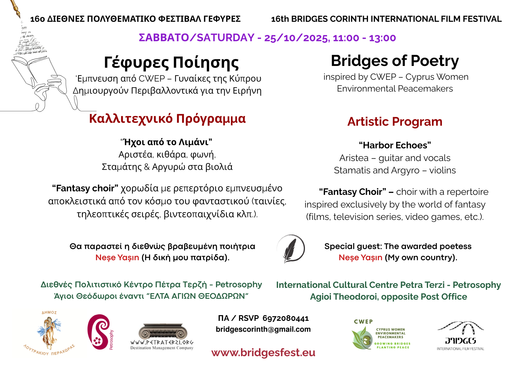 8. Γέφυρες Ποίησης με θέμα Γυναίκα, Περιβάλλον και Ειρήνη στο Διεθνές Πολιτιστικό Κέντρο Πέτρα Τερζή – Petrosophy στους Αγίους Θεοδώρους, με καλεσμένη την διεθνώς βραβευμένη ποιήτρια Neşe Yaşın (Η δική μου πατρίδα).