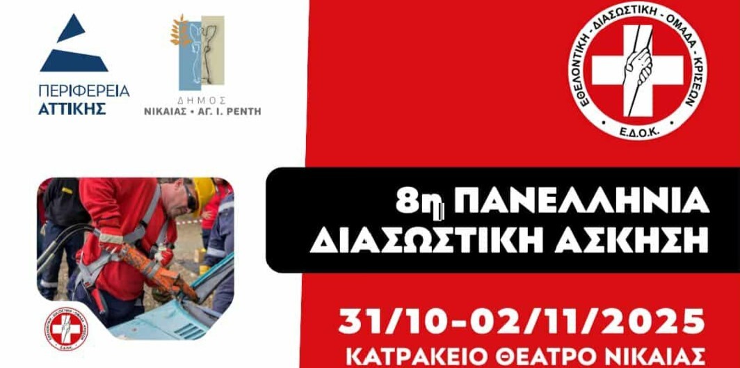 • Η 8η Πανελλήνια Διασωστική Άσκηση διοργανώνεται από την Ε.Δ.Ο.Κ. στον Δήμο Νίκαιας – Αγ. Ι. Ρέντη από 31 Οκτωβρίου έως 2 Νοεμβρίου 2025.
