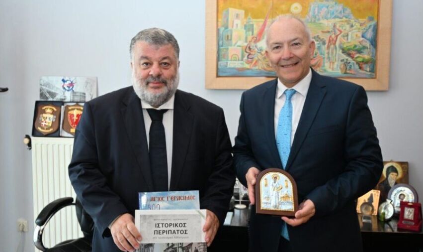 Την Δευτέρα 20 Οκτωβρίου 2025, ο Δήμαρχος Αργοστολίου και Πρόεδρος του Λιμενικού Ταμείου Κεφαλονιάς και Ιθάκης, κ. Θεόφιλος Μιχαλάτος, μαζί με τους Αντιδημάρχους κ.κ. Σπύρο Σαμούρη και Διονύση Κωνσταντάτο, υποδέχθηκαν στο Δημαρχείο, τον Υφυπουργό Ναυτιλίας και Νησιωτικής Πολιτικής, κ. Στέφανο Γκίκα.