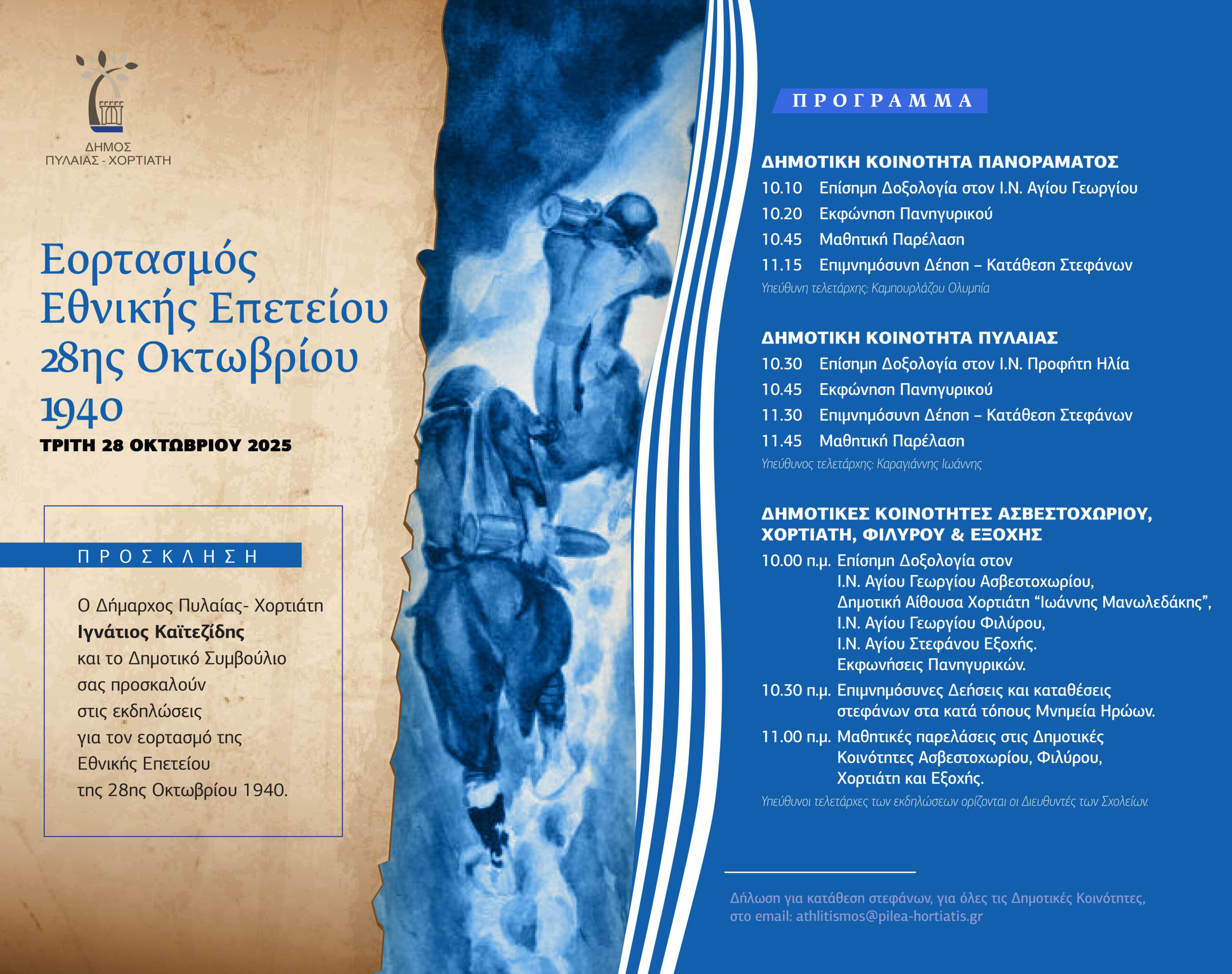- Ο Δήμος Πυλαίας – Χορτιάτη ετοιμάζεται να τιμήσει την εθνική επέτειο της 28ης Οκτωβρίου με λαμπρές εκδηλώσεις.