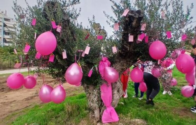 Στο τέλος του πάρκου Χρυσορρόα ένα δέντρο ελιάς στολίστηκε με τα ροζ μας μπαλόνια και καρτούλες με τα αρχικά των γυναικών ,που ο καθένας μας γνώριζε, οι οποίες στέφθηκαν νικήτριες στη μάχη ενάντια στον καρκίνο .