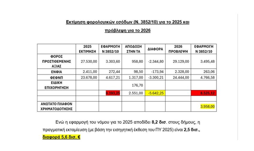 Με βάση το κατατεθέν Σχέδιο Κρατικού Προϋπολογισμού 2026, τον απολογισμό για το 2025 και την καλή πορεία των φορολογικών εσόδων, θα πρέπει να αποδοθούν το 2025 στην Τοπική Αυτοδιοίκηση, σύμφωνα με το νόμο 3852/2010, πάνω από 8,1 δισ. Ευρώ»!