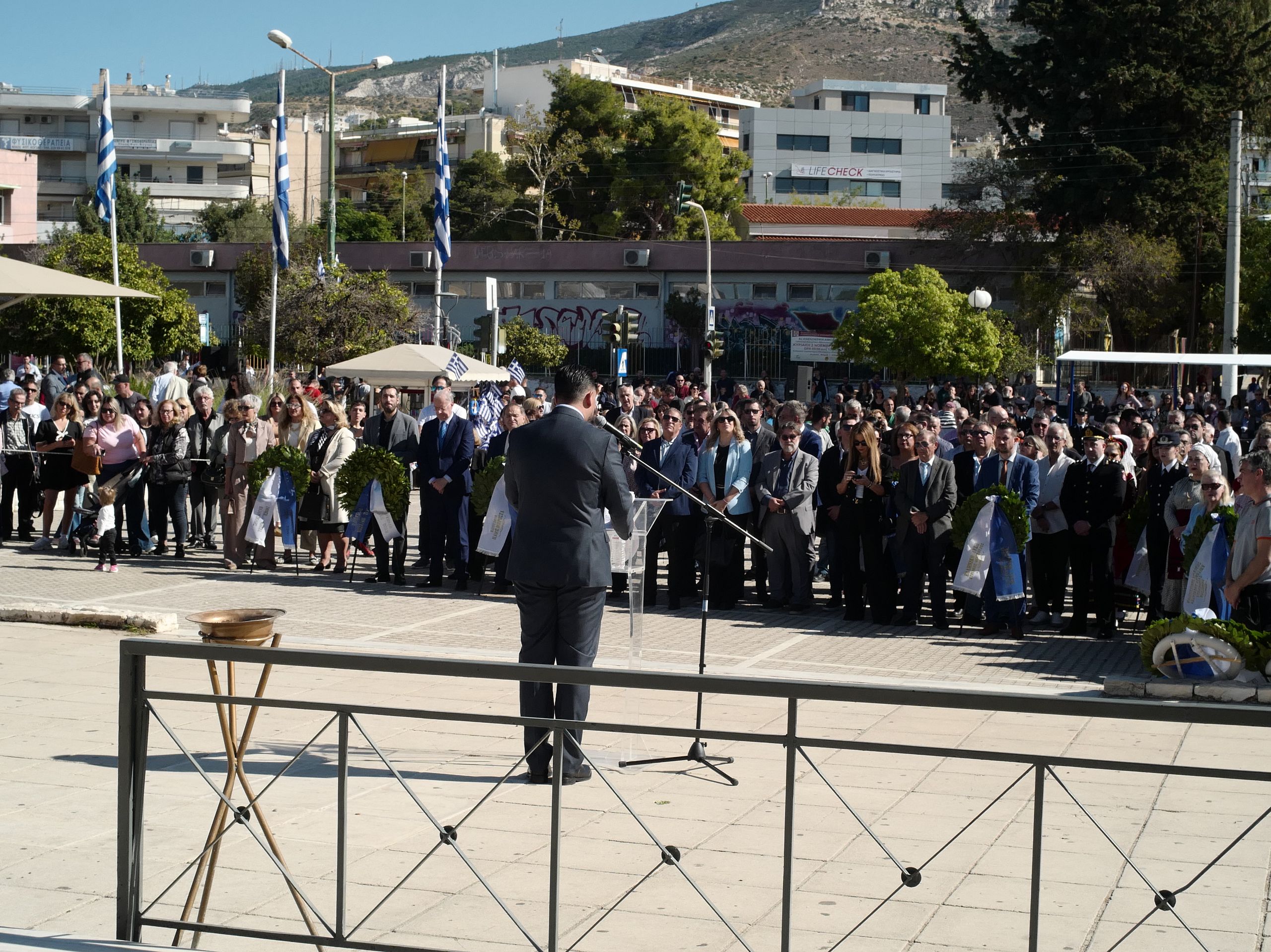 Στεφάνι κατέθεσαν ο Δήμαρχος Ηλιούπολης, η Περιφερειακή Σύμβουλος Κεντρικού Τομέα κα Μαρία Κουρή, – Προέδρος της Α.Μ.Κ.Ε. Αγροδιατροφικής Σύμπραξης Εκ μέρους της Περιφέρειας Αττικής και του Περιφερειάρχη κυρίου Νίκου Χαρδαλιά, η Πανελλήνια Οργάνωση Αγωνιστών Εθνικής Αντίστασης (Π.Ο.Α.Ε.Α.), ο Πανελλήνιος Σύνδεσμος Αγωνιστών Εθνικής Εαμικής Αντίστασης ( Π.Σ.Α.Ε.Ε.Α.), ο Σύνδεσμος Απόστρατων Σωμάτων Ασφαλείας Ηλιούπολης, η εκπρόσωπος του Αστυνομικού Τμήματος Ηλιούπολης, η Υπαστυνόμος κα Καπετάνου Γεωργία, ο εκπρόσωπος του 7ου Πυροσβεστικού Σταθμού Αθηνών, Πυραγός κος Χαμπίμπης Χρήστος, το Περιφερειακό Τμήμα του Ελληνικού Ερυθρού Σταυρού Ηλιούπολης, η Εθελοντική Ομάδα Δασοπροστασίας και Πυρόσβεσης Ηλιούπολης, το 1ο Σύστημα Προσκόπων Ηλιούπολης, το Κέντρο Ειδικής Εκπαίδευσης Παιδιών και Ενηλίκων με Αναπηρία (Κ.Ε.Ε.Π.Ε.Α) «Ορίζοντες», το Σωματείο Αποκατάστασης και Ειδικής Αγωγής Παιδιών με Αναπηρία «Παναγία Ευαγγελίστρια». Το Σώμα Ελληνικού Οδηγισμού αντί στεφάνου προσέφερε τρόφιμα στο κοινωνικό παντοπωλείο του Δήμου Ηλιούπολης.