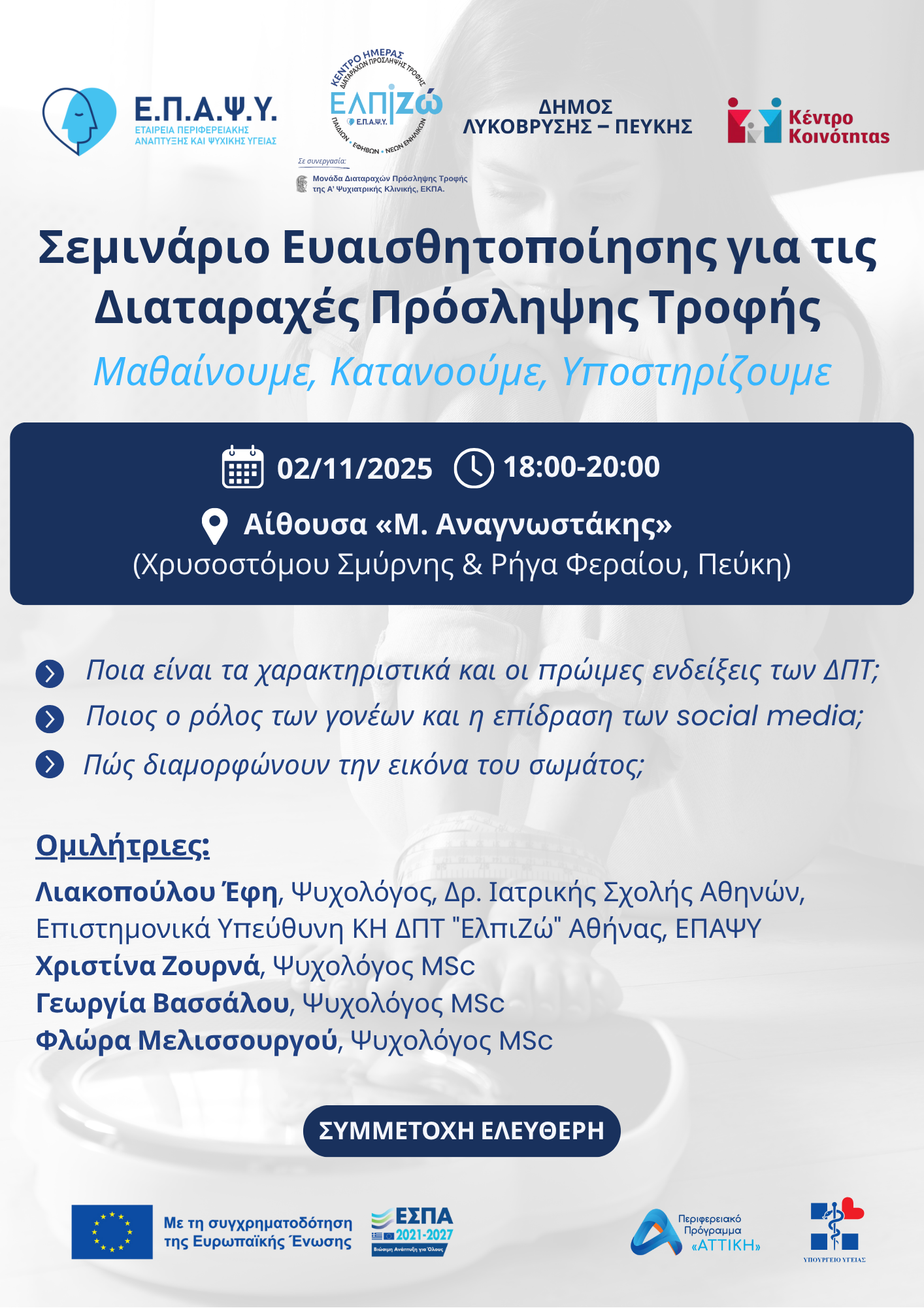 Την Κυριακή 2 Νοεμβρίου 2025 & ώρα: 18:00-20:00, ο Δήμος Λυκόβρυσης – Πεύκης σε συνδιοργάνωση με το Κέντρο Ημέρας Διαταραχών Πρόσληψης Τροφής «ΕλπιΖώ» Αθήνας της ΕΠΑΨΥ, σας προσκαλεί να συμμετάσχετε στο Σεμινάριο Ευαισθητοποίησης για τις Διαταραχές Πρόσληψης Τροφής.