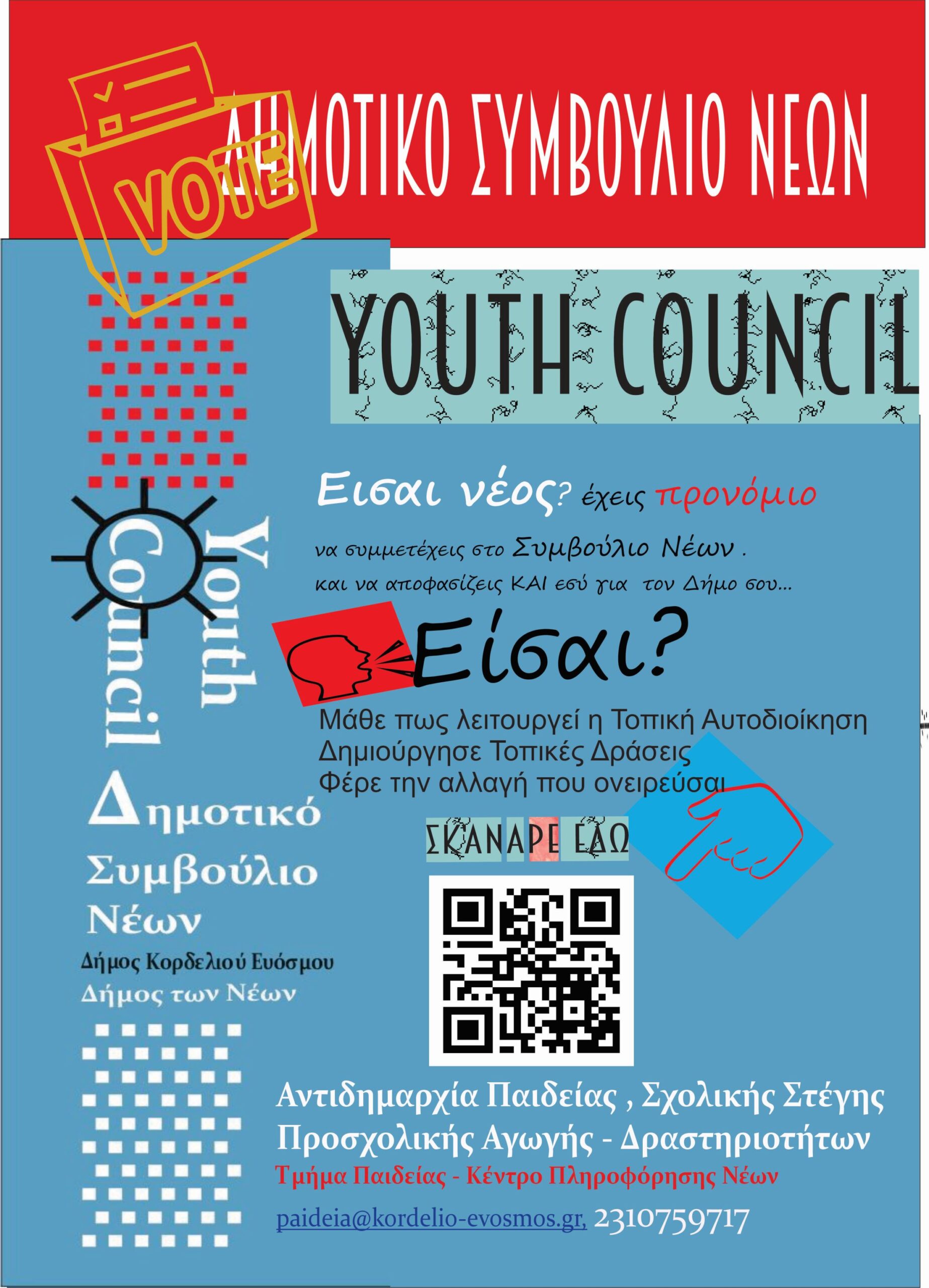 Με το σύνθημα «Γίνε μέλος του Συμβουλίου Νέων του Δήμου – Αποφάσισε για όλα αυτά που θα γίνουν για σένα, με εσένα μπροστά!», ο Δήμος Κορδελιού – Ευόσμου δια της Αντιδημαρχίας Παιδείας, Σχολικής Στέγης, Προσχολικής Αγωγής & Δραστηριοτήτων ανακοινώνει την έναρξη των εγγραφών στο Μητρώο Νέων, το οποίο αποτελεί το πρώτο βήμα ενόψει της συγκρότησης του νέου θεσμού, του Συμβουλίου Νέων.