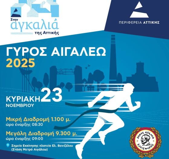 Ο Δήμος Αιγάλεω, σε συνδιοργάνωση με Αθλητικούς και Πολιτιστικούς Συλλόγους της πόλης και υπό την αιγίδα και τη χρηματοδότηση της Περιφέρειας Αττικής, διοργανώνει την Κυριακή 23 Νοεμβρίου 2025 τον καθιερωμένο αγώνα δρόμου «ΓΥΡΟΣ ΑΙΓΑΛΕΩ», μια γιορτή του μαζικού αθλητισμού και της συμμετοχής για όλες τις ηλικίες.
