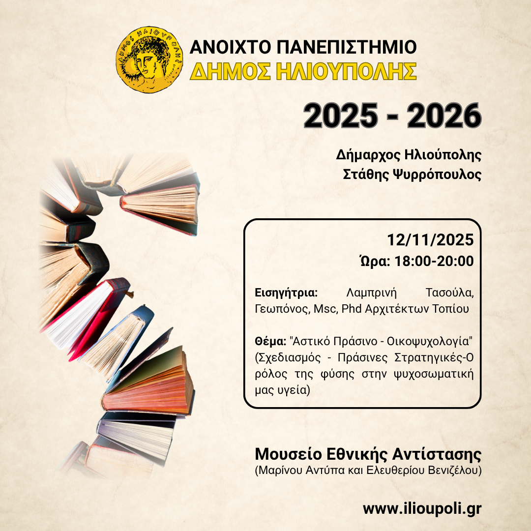 - Ο Δήμος Ηλιούπολης επαναφέρει το Ανοιχτό Πανεπιστήμιο για την περίοδο 2025-2026 με δωρεάν συμμετοχή και στόχο τη διά βίου μάθηση.
