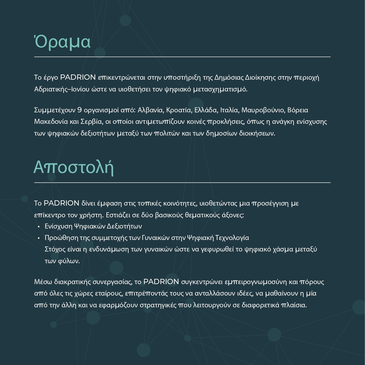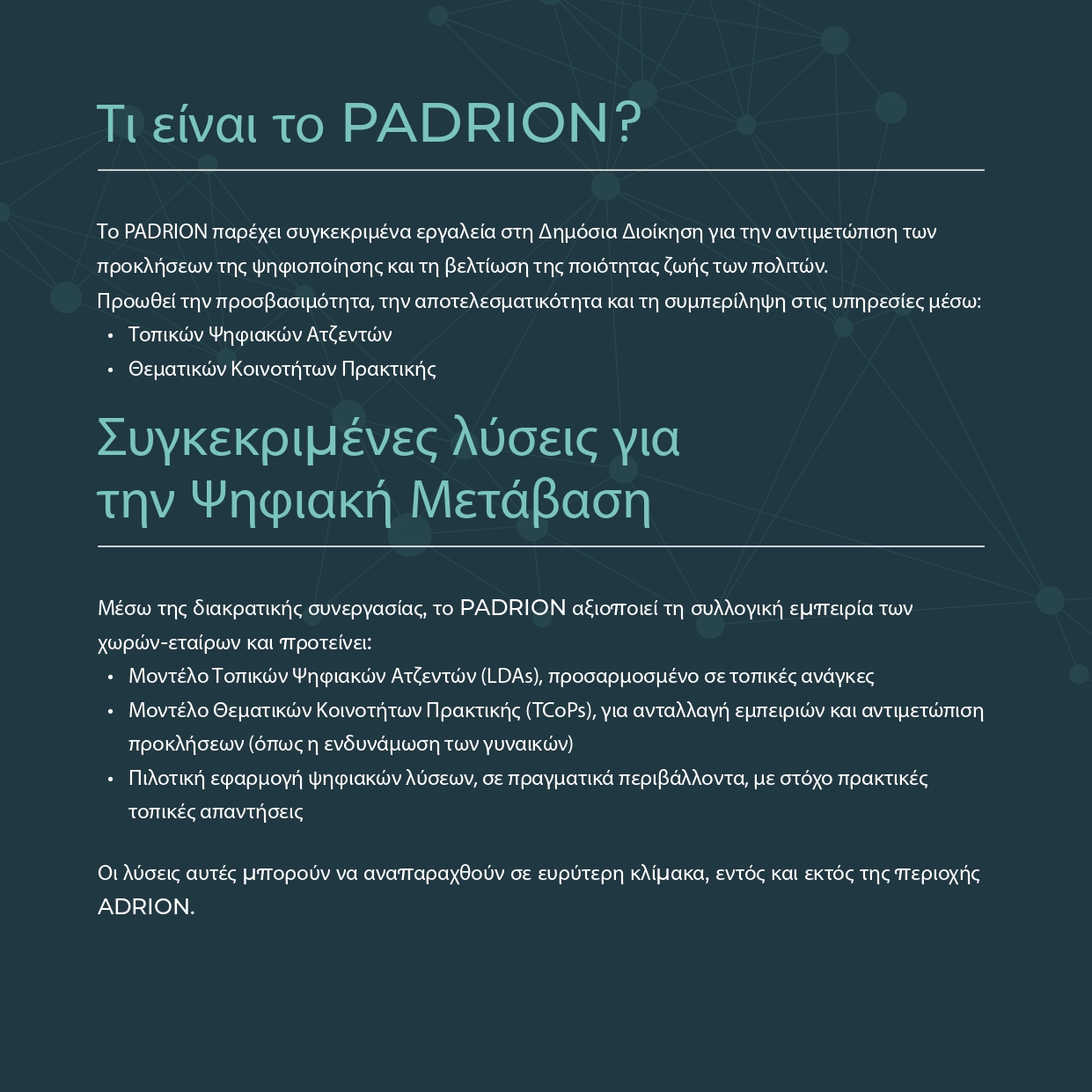 - Το PADRION επιδιώκει να προσφέρει εργαλεία στη Δημόσια Διοίκηση για τη βελτίωση της ποιότητας ζωής των πολιτών.