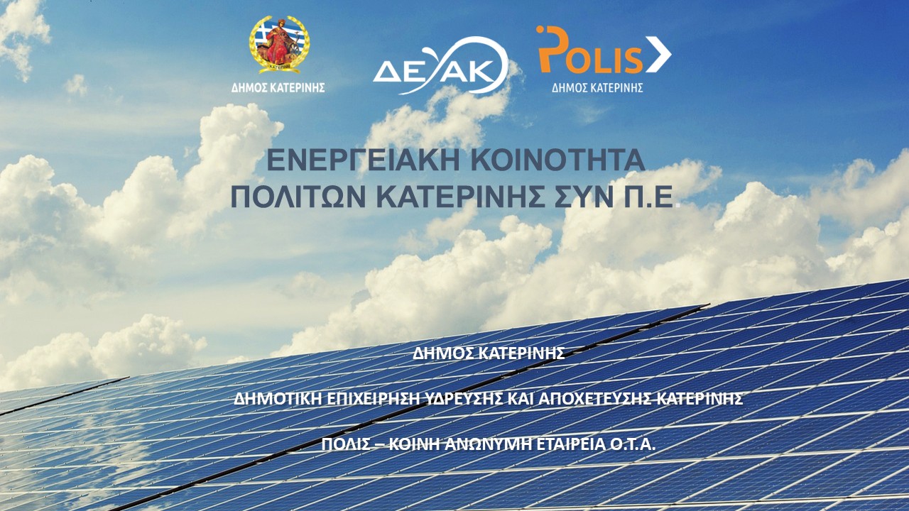 Στη σύνθεση της Ενεργειακής Κοινότητας Πολιτών Κατερίνης ΣΥΝ Π.Ε. θα συμμετέχουν ο ΔΗΜΟΣ ΚΑΤΕΡΙΝΗΣ, η ΔΗΜΟΤΙΚΗ ΕΠΙΧΕΙΡΗΣΗ ΥΔΡΕΥΣΗΣ ΚΑΙ ΑΠΟΧΕΤΕΥΣΗΣ ΚΑΤΕΡΙΝΗΣ και η «ΠΟΛΙΣ – ΚΟΙΝΗ ΑΝΩΝΥΜΗ ΕΤΑΙΡΕΙΑ Ο.Τ.Α.».