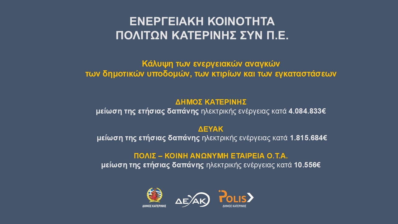 • Ο Δήμος Κατερίνης θα επιτύχει μείωση της ετήσιας δαπάνης ηλεκτρικής ενέργειας κατά 4.084.833€, η ΔΕΥΑ Κατερίνης κατά 1.815.684€ και τα Δημοτικά Πάρκινγκ ΠΟΛΙΣ ΑΕ κατά 10.556€.