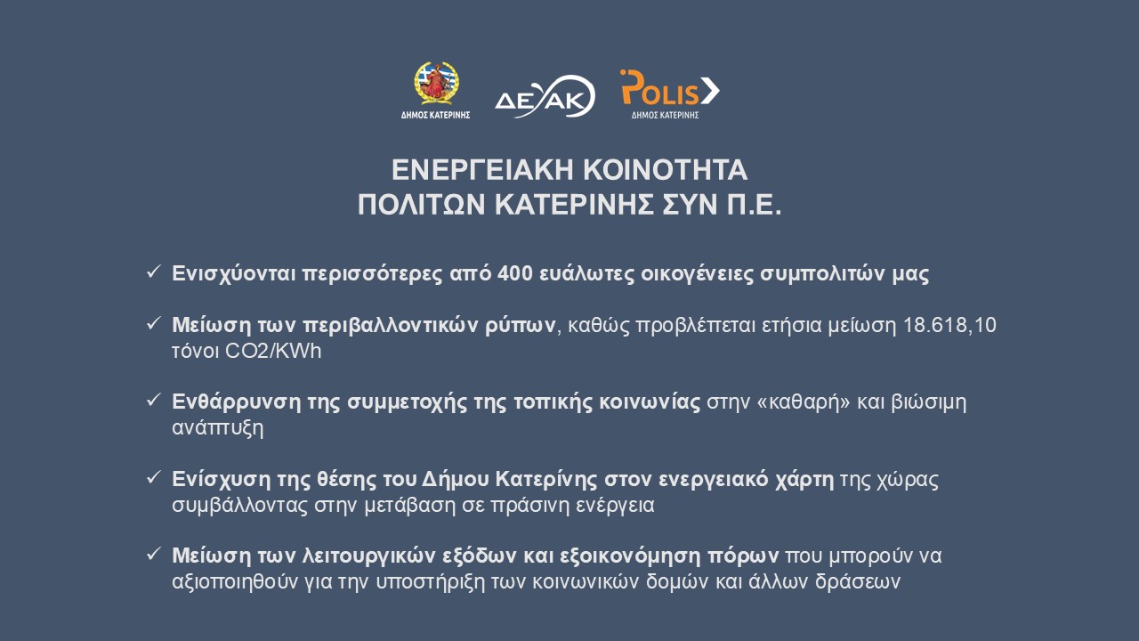 Σύμφωνα με τη μελέτη διερεύνησης των ενεργειακών αναγκών, με τα έργα εγκατάστασης φωτοβολταϊκών της ενεργειακής κοινότητας, τόσο ο Δήμος Κατερίνης όσο και οι δημοτικές επιχειρήσεις θα καλύψουν πλήρως τις ενεργειακές τους ανάγκες, ενώ θα υπάρξει και στήριξη ενός σημαντικού αριθμού ευάλωτων νοικοκυριών με την προσφορά δωρεάν ηλεκτρικής ενέργειας.