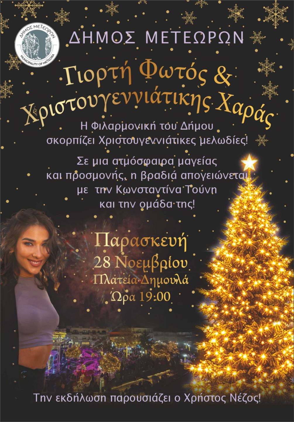 - Ο Δήμος Μετεώρων εγκαινιάζει τη χριστουγεννιάτικη περίοδο με τη Γιορτή Φωτός & Χριστουγεννιάτικης Χαράς, σήμερα στις 19:00 στην Πλατεία Δημουλά.