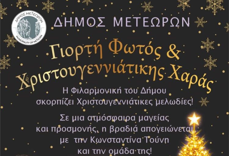 - Ο Δήμος Μετεώρων εγκαινιάζει τη χριστουγεννιάτικη περίοδο με τη Γιορτή Φωτός & Χριστουγεννιάτικης Χαράς, σήμερα στις 19:00 στην Πλατεία Δημουλά.