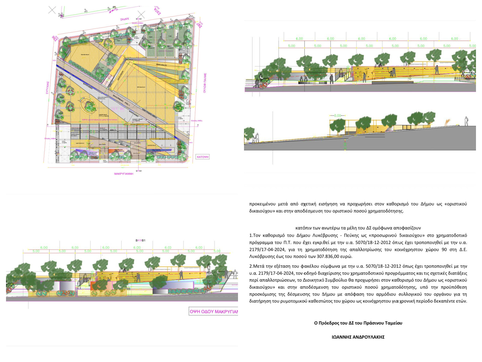 - Ο Δήμος Λυκόβρυσης-Πεύκης εξασφάλισε χρηματοδότηση 307.836 ευρώ από το Πράσινο Ταμείο για την απόκτηση της πλατείας Α. Παπανδρέου.