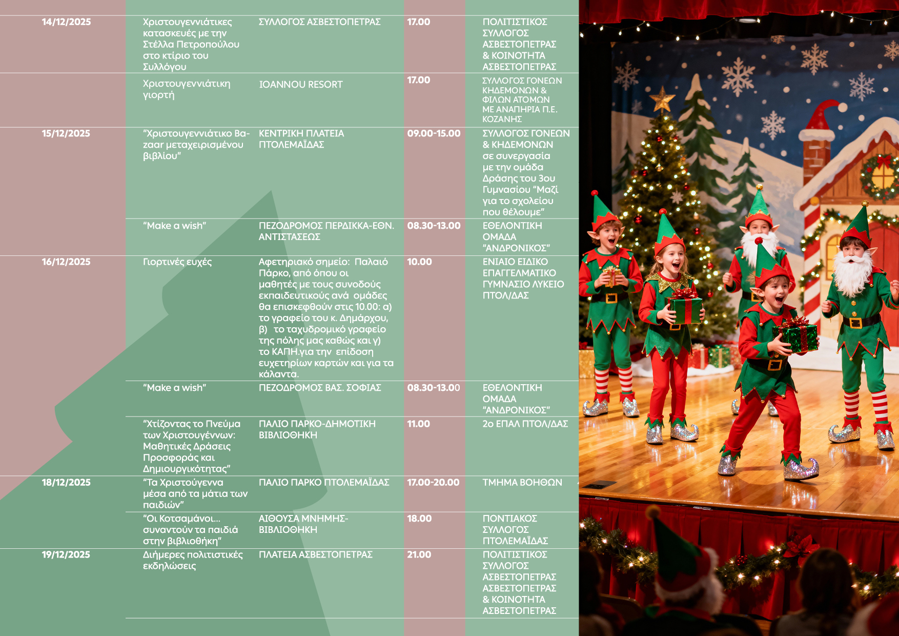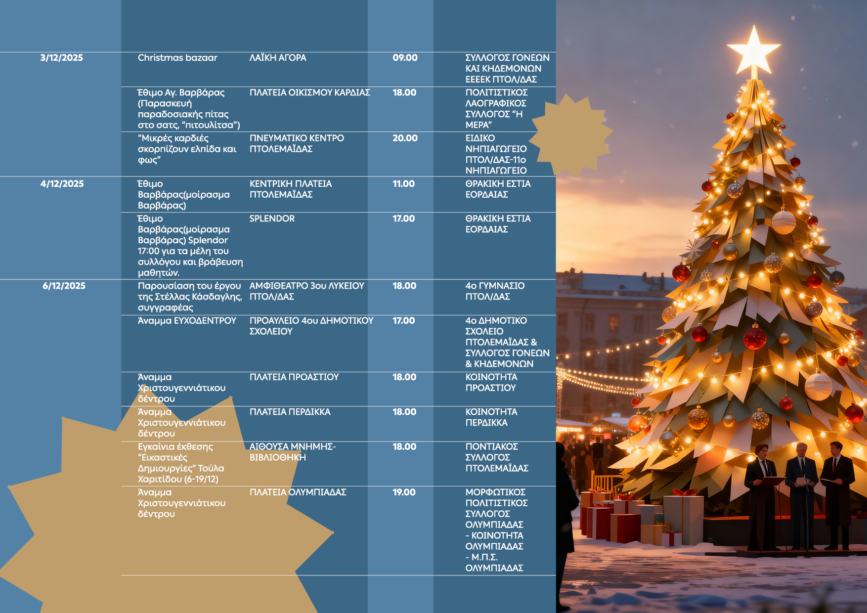 • Την Τετάρτη 10 Δεκεμβρίου 2025, στις 19:00, στην κεντρική πλατεία Πτολεμαΐδας, ο Δήμος Εορδαίας προσκαλεί μικρούς και μεγάλους στη φωταγώγηση του χριστουγεννιάτικου δέντρου.