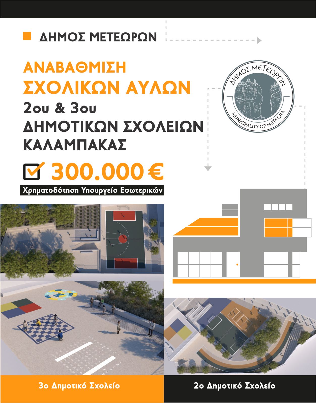 - Ο Δήμος Μετεώρων εξασφάλισε 300.000 ευρώ από το Υπουργείο Εσωτερικών για την αναβάθμιση των σχολικών αυλών του 2ου και 3ου Δημοτικού Σχολείου Καλαμπάκας.