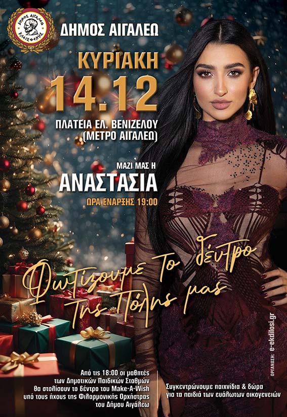 Ο Δήμος Αιγάλεω προσκαλεί στην επίσημη έναρξη των χριστουγεννιάτικων εορτασμών της πόλης μας, την Κυριακή 14 Δεκεμβρίου 2025, στις 19:00, στην πλατεία Ελευθερίου Βενιζέλου (Μετρό Αιγάλεω).