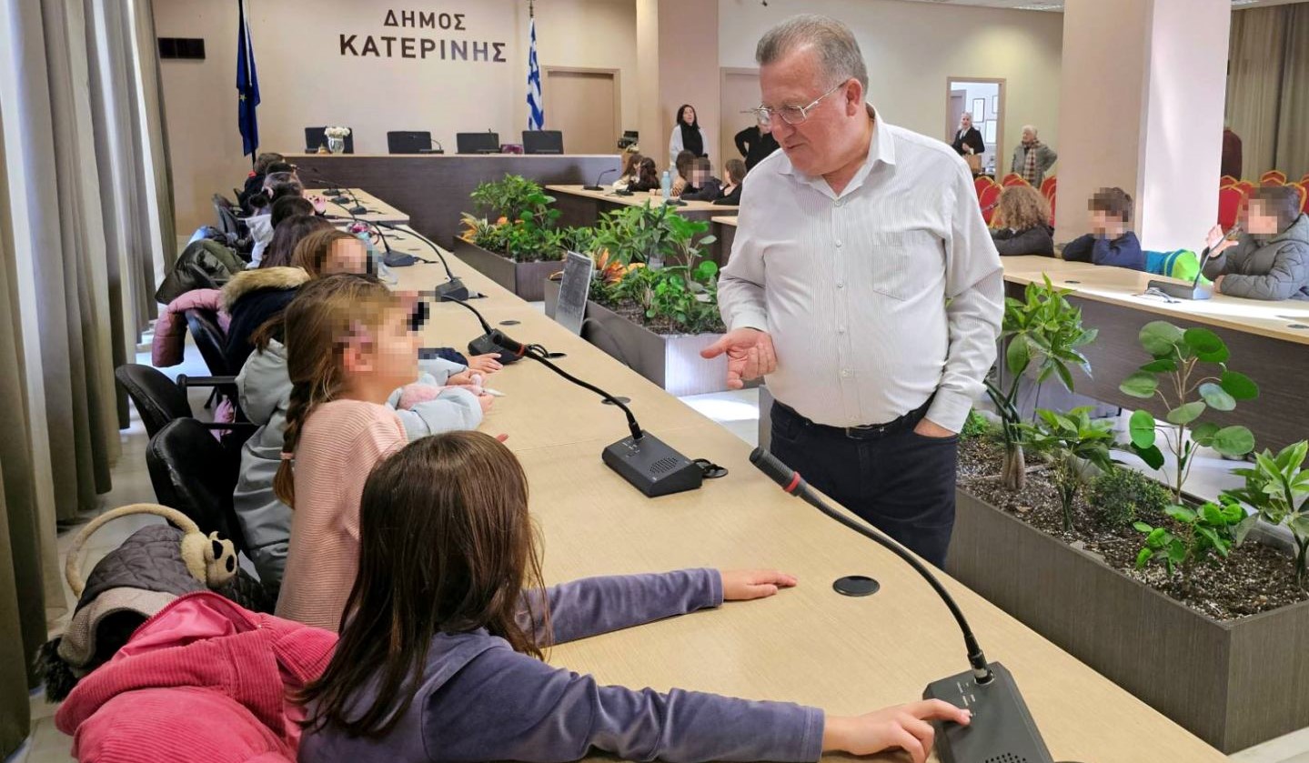 Ο Δήμαρχος Κατερίνης, Ιωάννης Ντούμος, υποδέχθηκε τους μικρούς επισκέπτες στην αίθουσα του Δημοτικού Συμβουλίου.