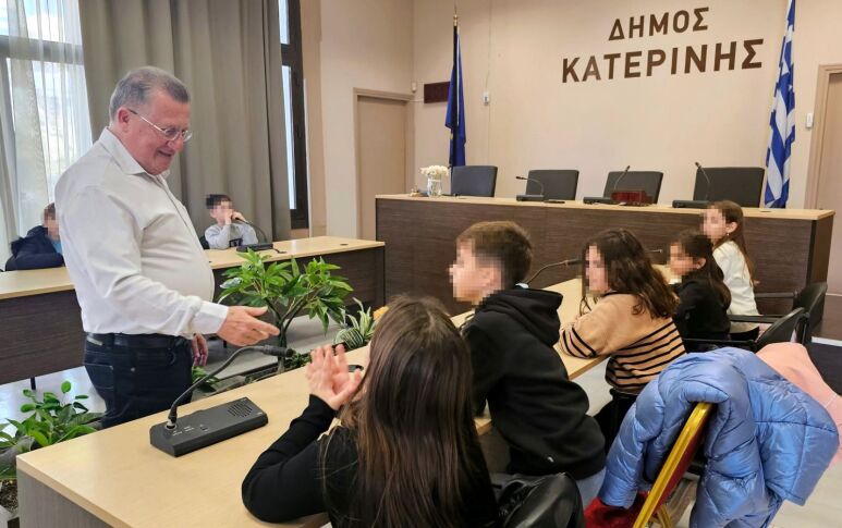 Ο Δήμαρχος Κατερίνης, Ιωάννης Ντούμος, υποδέχθηκε τους μικρούς επισκέπτες στην αίθουσα του Δημοτικού Συμβουλίου.