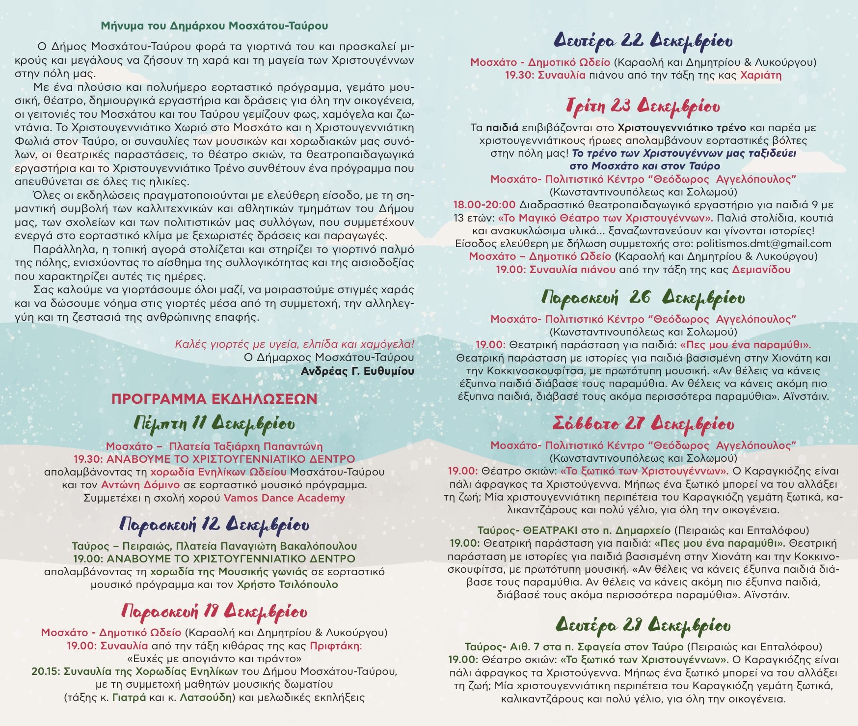 Εορταστικό πρόγραμμα εκδηλώσεων στον Δήμο Μοσχάτου-Ταύρου