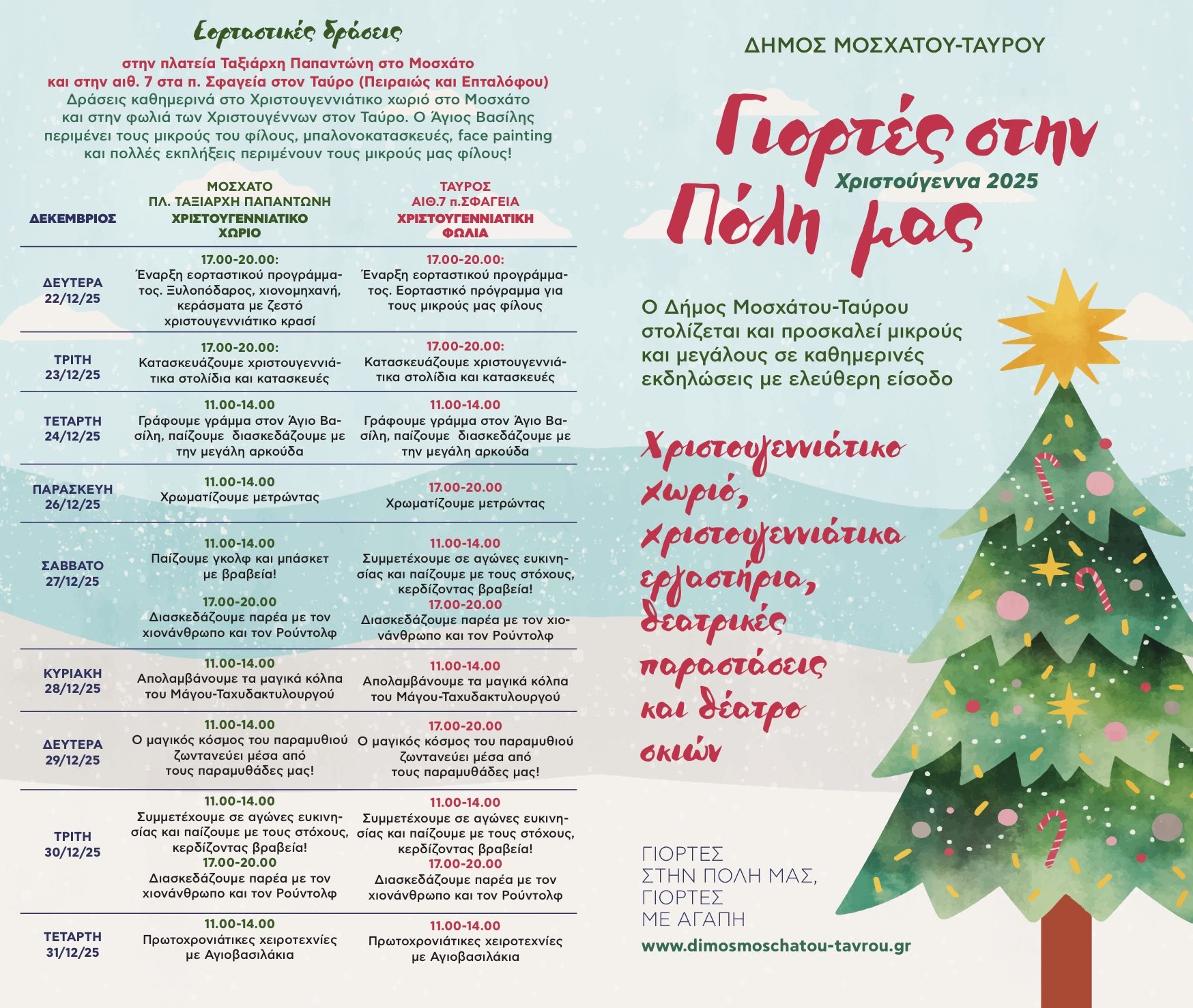 • Ο Δήμος Μοσχάτου-Ταύρου διοργανώνει εορταστικές εκδηλώσεις για όλες τις ηλικίες, με κεντρικό σημείο το Χριστουγεννιάτικο Χωριό και τη Φωλιά των Χριστουγέννων.