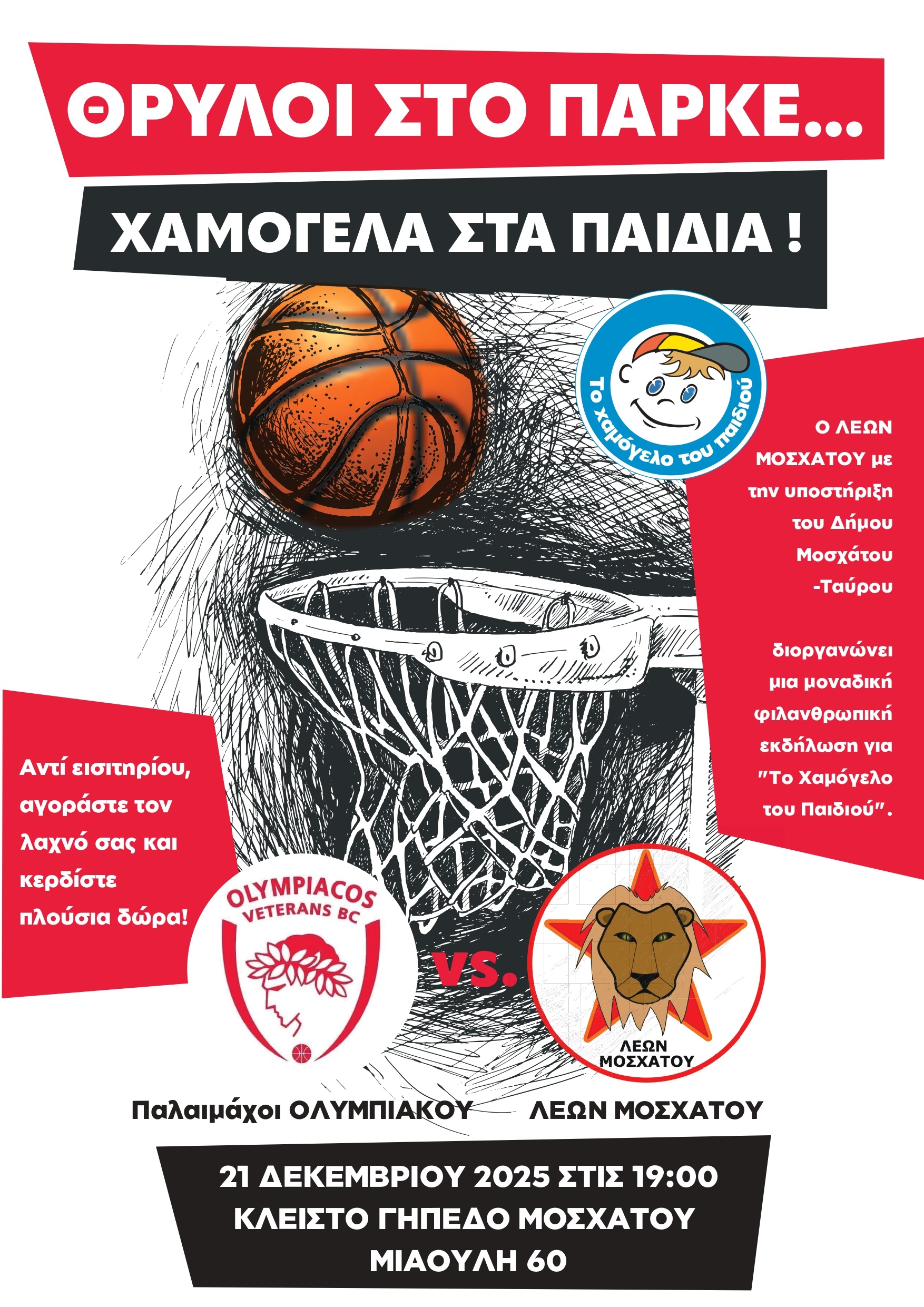 Ο Δήμος Μοσχάτου-Ταύρου, σε συνεργασία με τον Α.Σ. Λέων Μοσχάτου και την ομάδα Οlympiacos Veterans BC, διοργανώνει φιλανθρωπικό αγώνα μπάσκετ στις 21 Δεκεμβρίου 2025, στο Κλειστό Γήπεδο Μοσχάτου, για την ενίσχυση του οργανισμού «Το Χαμόγελο του Παιδιού».