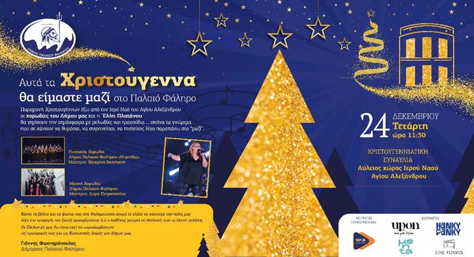 Παραμονή Χριστουγέννων έξω από τον Ιερό Ναό Αγίου Αλεξάνδρου, οι Χορωδίες του Δήμου Παλαιού Φαλήρου και η Έλλη Πλατάνου θα γεμίσουν την ατμόσφαιρα με μελωδίες και τραγούδια…εκείνα τα γνώριμα, που σε κάνουν να θυμάσαι, να συγκινείσαι, να πιστεύεις λίγο παραπάνω στο “μαζί”.