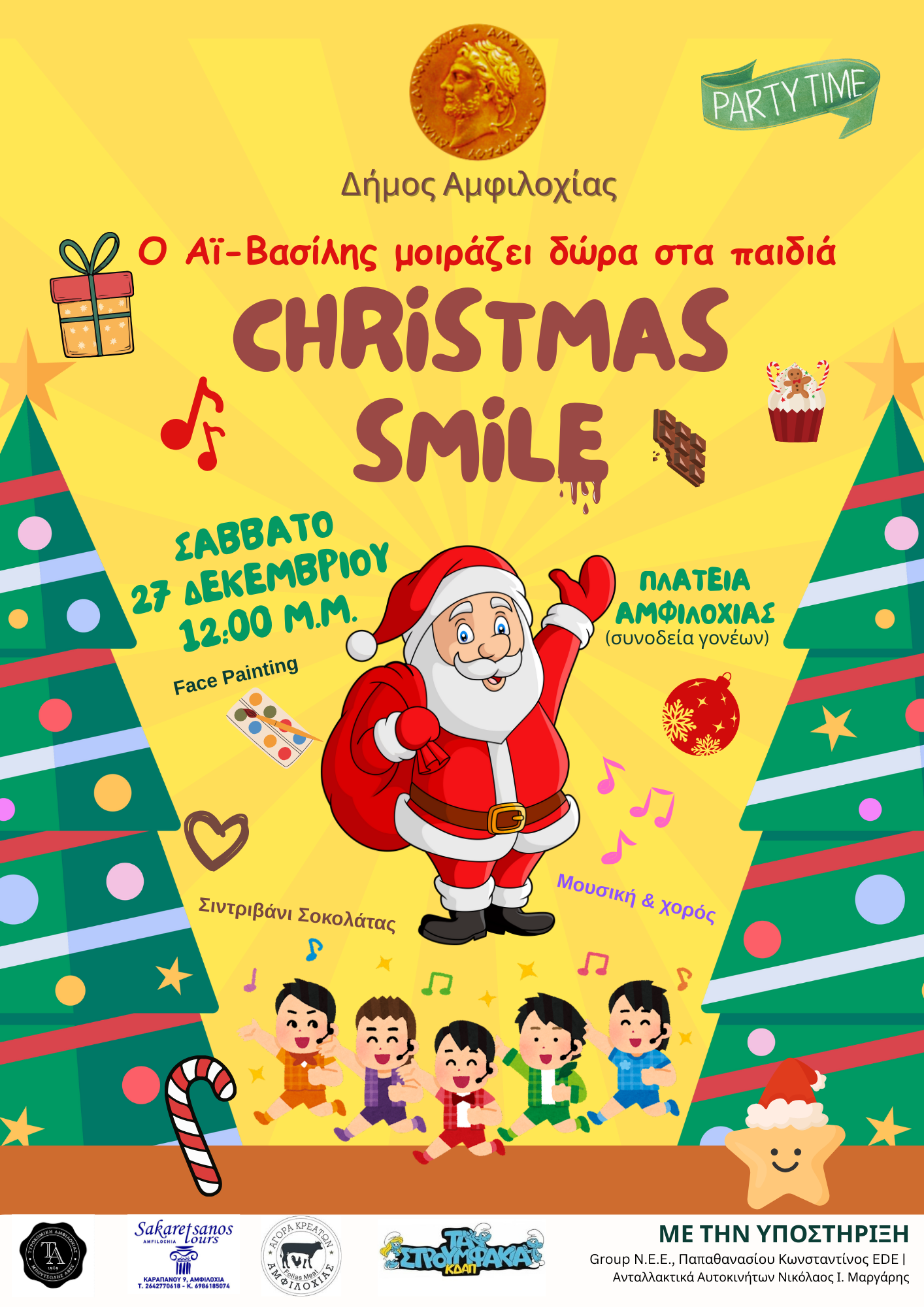 • Στις 27 Δεκεμβρίου, η κεντρική πλατεία του Δήμου Αμφιλοχίας θα φιλοξενήσει την εκδήλωση «Christmas Smile» για παιδιά.
