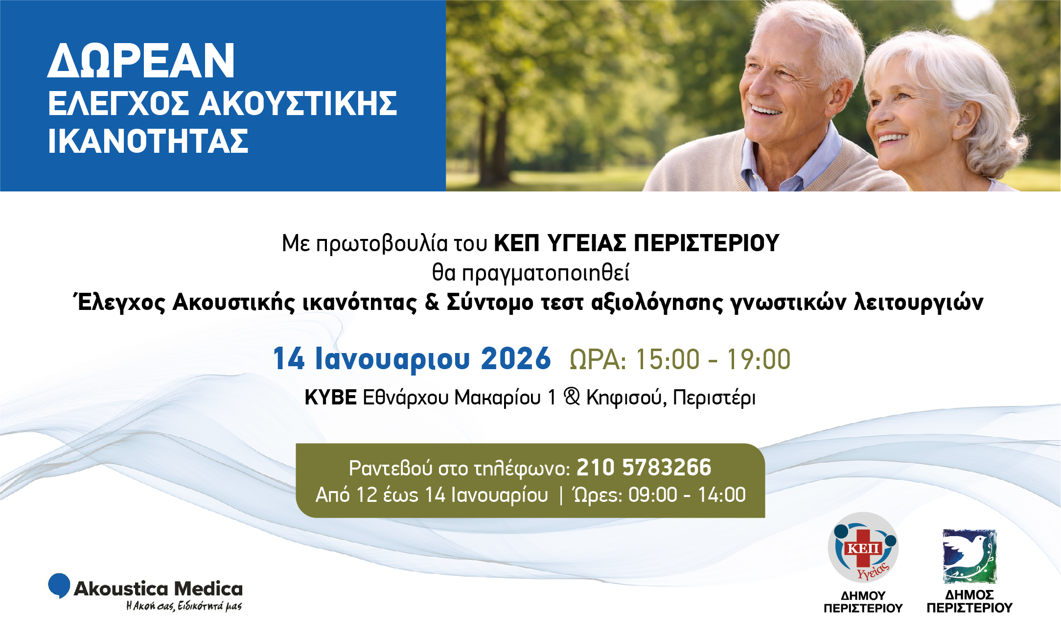 Η δράση θα πραγματοποιηθεί την Τετάρτη 14 Ιανουαρίου 2026, από τις 15:00 έως τις 19:00, στο ΚΥΒΕ (Εθνάρχου Μακαρίου 1 & Κηφισού, Περιστέρι). Η συμμετοχή είναι δωρεάν και απευθύνεται σε πολίτες που επιθυμούν να ελέγξουν προληπτικά την ακοή τους και βασικές γνωστικές λειτουργίες.