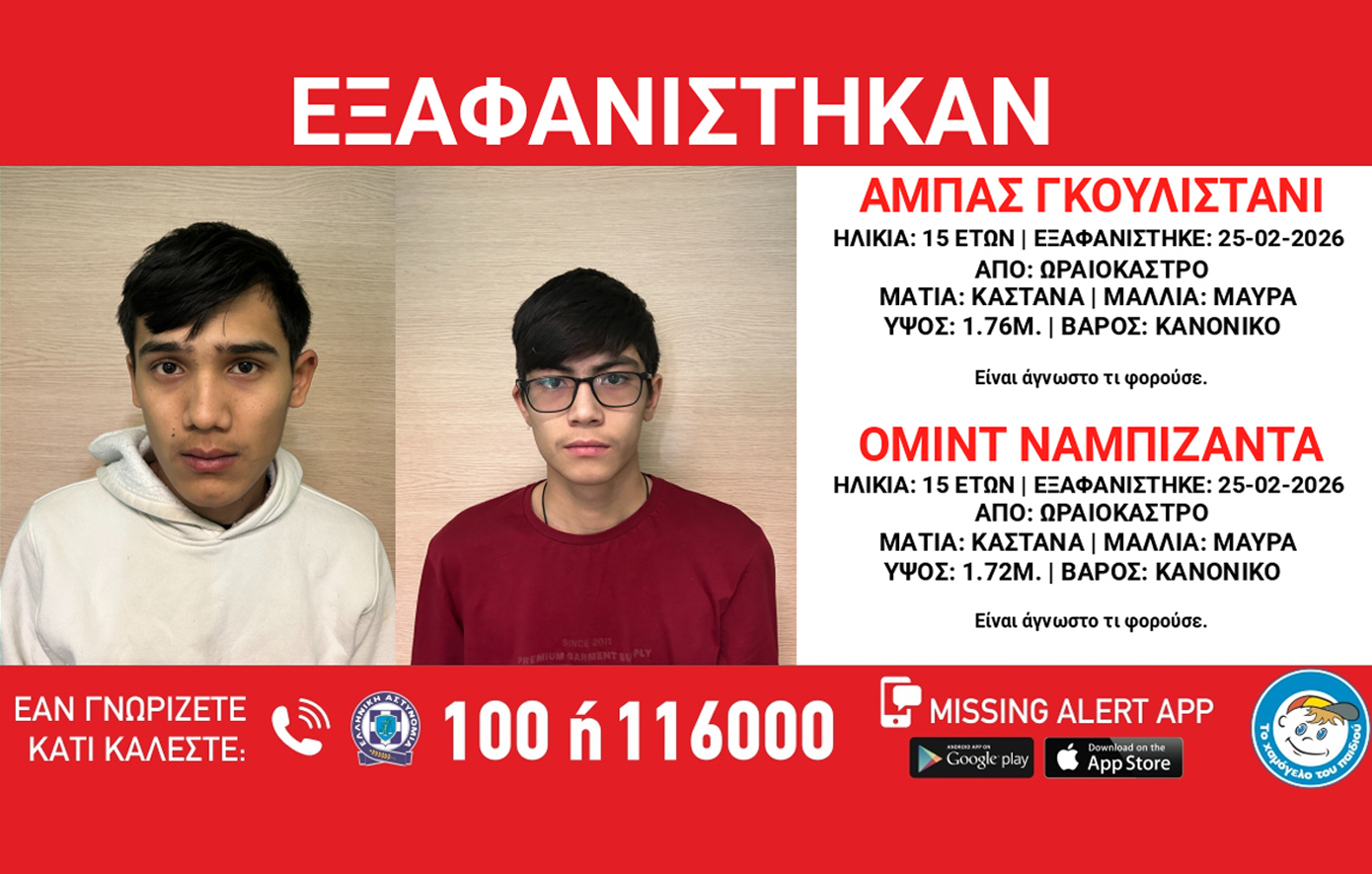 Εξαφανίστηκαν χθες, Τετάρτη, 25 Φεβρουαρίου, από χώρο φιλοξενίας ασυνόδευτων ανηλίκων στο Ωραιόκαστρο Θεσσαλονίκης ο Abbas Gulistani και ο Omid Nabizada, 15 ετών, αφγανικής καταγωγής.