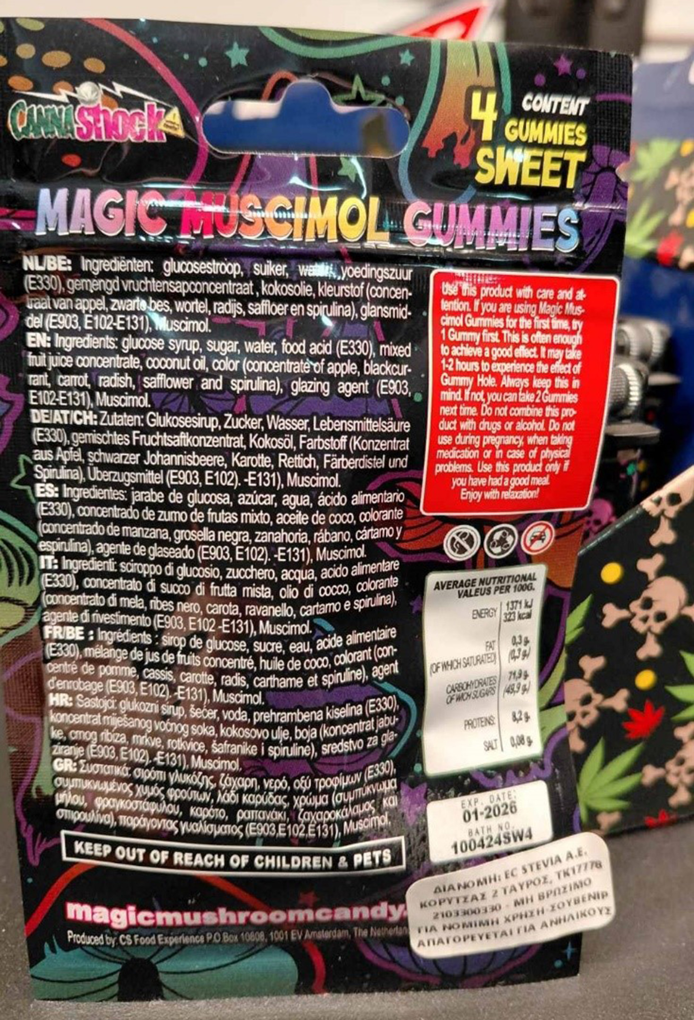 Το προϊόν εξετάστηκε από το Γ’ Τμήμα Ναρκωτικών της Β’ Χημικής Υπηρεσίας Αθηνών του Γενικού Χημείου του Κράτους της ΑΑΔΕ, όπου διαπιστώθηκε η παρουσία της ουσίας μουσκιμόλη, η οποία προέρχεται από το μανιτάρι Amanita muscaria και παρουσιάζει ψυχοδραστικές ιδιότητες.