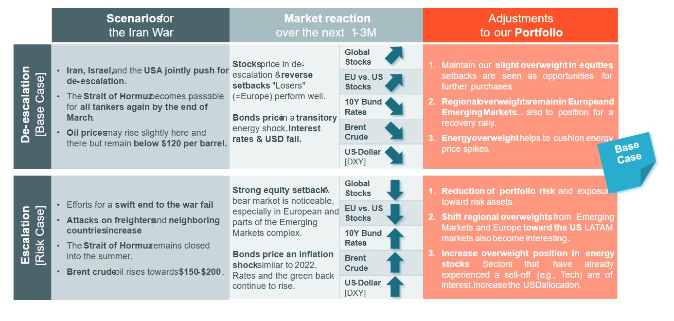 Παρά την αβεβαιότητα, η σύσταση είναι οι επενδυτές να μην υποτιμήσουν τη σημασία των μετοχών αυτή τη στιγμή. Το βασικό σενάριο παραμένει ότι η σύγκρουση θα αποκλιμακωθεί σταδιακά στο προσεχές διάστημα, οδηγώντας σε ανάκαμψη των αγορών μετά την πτώση των τελευταίων εβδομάδων. Σε αυτό το πλαίσιο, προτείνεται διατήρηση της έκθεσης σε μετοχές πάνω από το επίπεδο αναφοράς, με έμφαση σε αγορές που έχουν πληγεί περισσότερο από την άνοδο του πετρελαίου, όπως η Ευρώπη και οι αναδυόμενες αγορές.