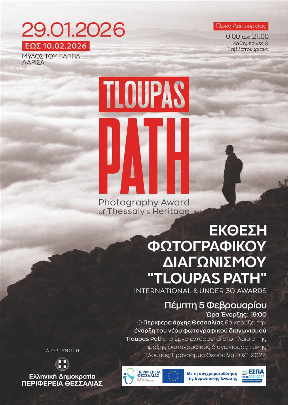 Η Περιφέρεια Θεσσαλίας ανοίγει την έκθεση φωτογραφίας Tloupas PATH – Photography Award of Thessaly’s Heritage, όπου παρουσιάζει τα έργα που διακρίθηκαν στους δύο ετήσιους διαγωνισμούς του θεσμού, στο TLOUPAS PATH INTERNATIONAL AWARD και στο TLOUPAS PATH UNDER 30 AWARD 2025.