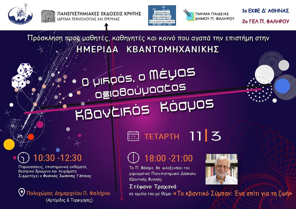 Ο Δήμος Παλαιού Φαλήρου, με τις Δημοτικές Βιβλιοθήκες Παλαιού Φαλήρου και το Τμήμα Παιδείας, το 1ο Εργαστηριακό Κέντρο Φυσικών Επιστημών (ΕΚΦΕ) Δ’ Αθήνας, το 2ο Γενικό Λύκειο (ΓΕΛ) Παλαιού Φαλήρου και οι Πανεπιστημιακές Εκδόσεις Κρήτης (ΠΕΚ), θα πραγματοποιήσουν με αφορμή το Διεθνές Έτος Κβαντικής Επιστήμης και Τεχνολογίας το οποίο ήταν το 2025 και τη συμπλήρωση 100 χρόνων από την θεμελίωση και ανάπτυξη της Κβαντομηχανικής, ημερίδα Κβαντομηχανικής: «Ο μικρός, ο Μέγας, αξιοθαύμαστος Κβαντικός Κόσμος!».