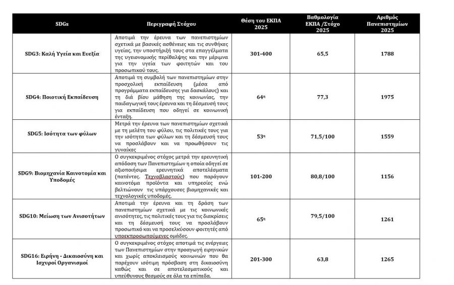 - Στις θέσεις 201-300 παγκοσμίως στον Στόχο 16: Ειρήνη – Δικαιοσύνη και Ισχυροί Οργανισμοί (SDG 16 Peace, Justice and Strong Institutions)