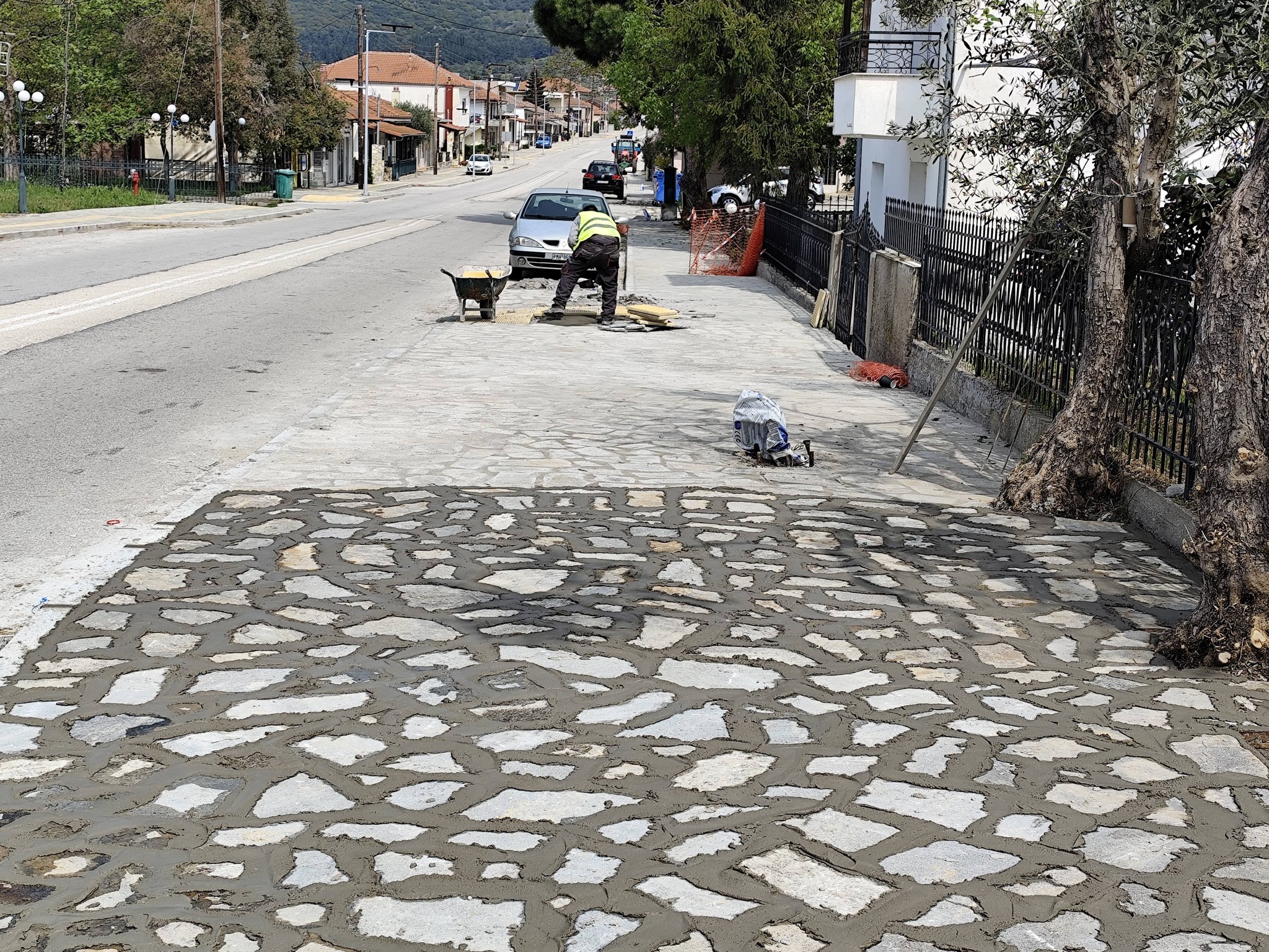 Παράλληλα, συνεχίζονται οι εργασίες τοποθέτησης ακανόνιστων πλακών στα πεζοδρόμια, ενώ έχει ήδη ολοκληρωθεί η εγκατάσταση νέων στύλων φωτισμού κατά μήκος της κεντρικής οδού.