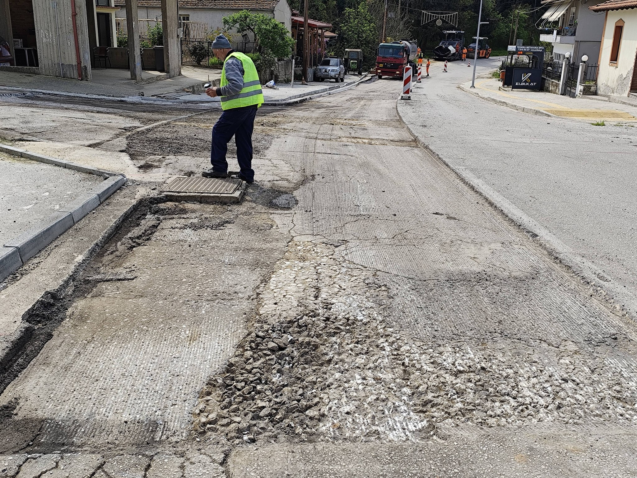Σήμερα το πρωί ξεκίνησε η εκσκαφή του οδοστρώματος, με την κατάλληλη κλίση για την ομαλή απορροή των ομβρίων υδάτων, και η συγκολλητική επάλειψη πριν τη διάστρωση σσφαλτικού σκυροδέματος.