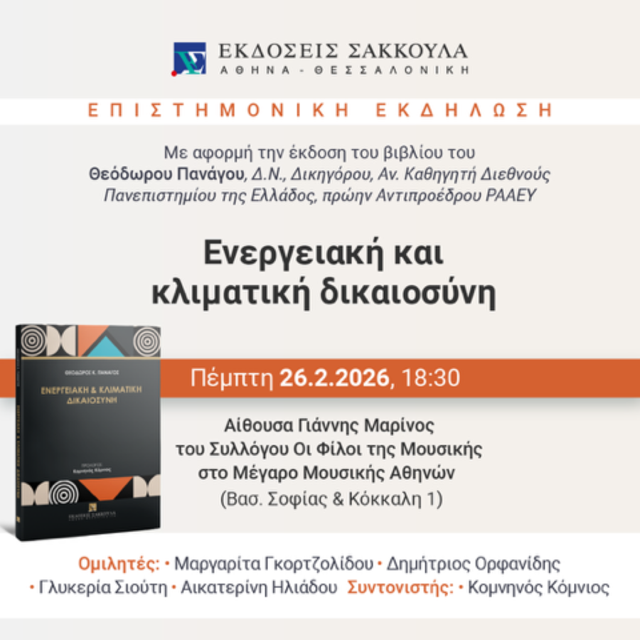 Την Πέμπτη 26 Φεβρουαρίου 2026, στις 18:30, στην Αίθουσα «Γιάννης Μαρίνος» του Συλλόγου «Οι Φίλοι της Μουσικής», στο Μέγαρο Μουσικής Αθηνών (Βασ. Σοφίας & Κόκκαλη 1), θα πραγματοποιηθεί η παρουσίαση του βιβλίου του καθηγητή Θεοδώρου Πανάγου με τίτλο «Ενεργειακή και Κλιματική Δικαιοσύνη».