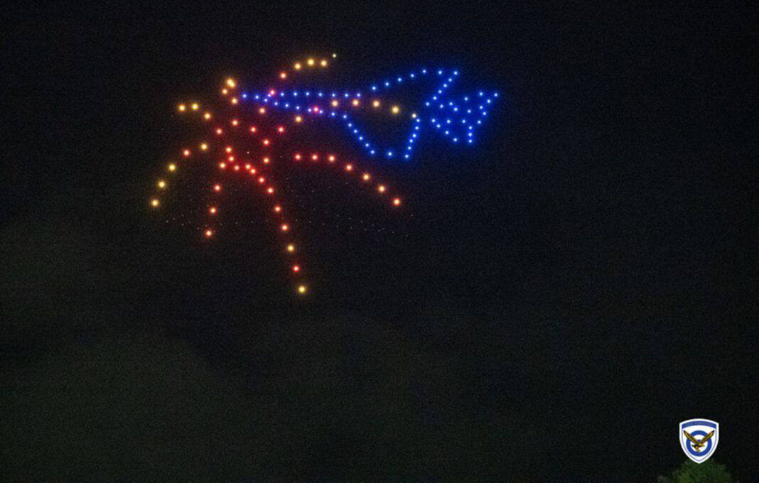 Τα drones ενώθηκαν στον αέρα και, με διάφορα χρώματα, σχημάτισαν μαχητικά αεροσκάφη της Πολεμικής Αεροπορίας, αλλά και το σύνθημά της, «Αιέν Υψικρατείν» («Πάντοτε να κυριαρχείς στα ύψη»).