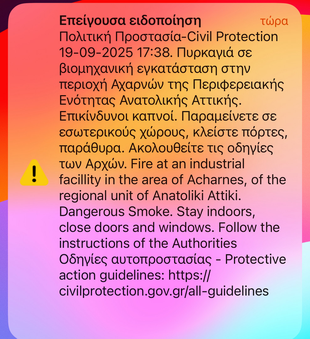 Επίσης, νωρίτερα το 112 έστειλε μήνυμα στους κατοίκους της περιοχής των Αχαρνών, προειδοποιώντας για τη φωτιά στη βιομηχανική εγκατάσταση.