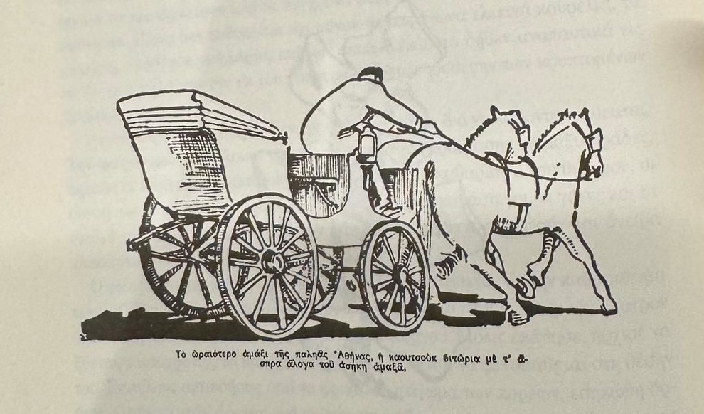 «Στις άμαξες της εποχής εκείνης συνηντώντο οι πλατωνικώς ερωτευμένοι, που έκαναν τον συμπαθητικό περίπατο του γύρου της Κολοκυνθούς κρατώντας τα χέρια σφικτά -και μόνον αυτό- για να δώσουν αμοιβαίαν υπόσχεσην ερωτικού δεσμού, αρραβώνων, γάμου. Η κλειστή κουκούλα της θαυμασίας Βικτόριας άφηνε να φαίνονται μόνον τα πόδια του ερωτικού ζευγαριού, που μαζί με τους ντορήδες έτρεχε κι αυτό πολύ πλέον ανοικτά στη ζωή από τα πλατωνικώς συνδεδεμένα ζευγάρια. Οι αμαξάδες του Συντάγματος και της Ομονοίας, αραδιασμένοι γύρω γύρω στις δυο πλατείες, περίμεναν τους πελάτες τους. Είχαν αστραφτερά τα χάμουρα, γυαλιστά τα αμάξια, στην τρίχα ξυστρισμένα τα άλογα και φρεσκοβερνικωμένα τα νύχια των ζώων, που ανυπόμονα κτυπούσαν τα πόδια τους και ανεβοκατέβαζαν υπερήφανα τα κεφάλια τους με τις καλοχτενισμένες χαίτες, πλεγμένες κάποτε και με κόκκινα στενά κορδελάκια. Οι αμαξάδες είχαν τους τακτικούς πελάτες τους. Τους εξυπηρετούσαν με αφοσίωση, παρακολουθούσαν τη ζωή τους, ήξεραν τα σοβαρότερα μυστικά τους χωρίς ποτέ να τα μεταχειρισθούν ή να τα εκμεταλλευθούν […] Ο καλός Αθηναίος αμαξάς κρατώντας τα ηνία ήταν μια ασφάλεια της ζωής. Σπάνια ήσαν τότε τα δυστυχήματα. Καμιά φορά μόνον διαβάζαμε εις τας εφημερίδας: «’Αμαξα από ρυτήρος ελαύνουσα, παρέσυρε εις την καμπήν της οδού Παλαιού Φαλήρου, συνοικία Μακρυγιάνη, γραίαν και την εμωλώπησε σοβαρώς. Η άμαξα κατόπιν εξηφανίσθη προς την οδόν Φαλήρου. Ο αμαξάς θα παραμείνει ένας αληθινός τύπος της παλιάς Αθήνας, τύπος σπάνιος, που θαυμαστά συνεκέντρωνε όλα τα προτερήματα μαζί με πολλά ελαττώματα του Ρωμιού.