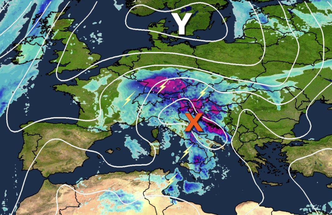 Από τη μία ο αντικυκλώνας στέλνει ψυχρότερο αέρα από τη βόρεια Ευρώπη προς το βαρομετρικό χαμηλό και από την άλλη το βαρομετρικό χαμηλό αλληλεπιδρά με θερμές θαλάσσιες εκτάσεις.