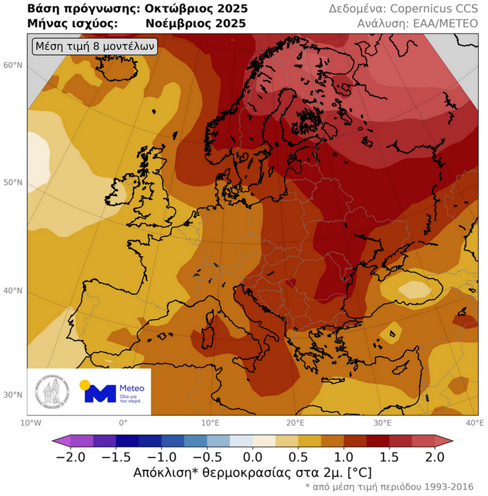 - Ο Νοέμβριος αναμένεται να είναι θερμότερος από το συνηθισμένο στη ΝΑ Ευρώπη, συμπεριλαμβανομένης της Ελλάδας, λόγω κλιματικής αλλαγής.