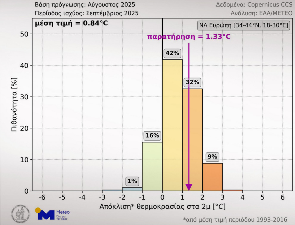 Όσον αφορά τον περασμένο Σεπτέμβριο, η μέση θερμοκρασιακή απόκλιση στην ΝΑ Ευρώπη ήταν +1.33°C, ενώ η μέση τιμή όλων των σεναρίων της μακροπρόθεσμης πρόγνωσης που εκδόθηκε τον Αύγουστο του 2025 ήταν +0.84°C. Όπως φαίνεται στο παρακάτω γράφημα (Εικόνα 3), το μέγεθος της απόκλισης που παρατηρήθηκε είχε πιθανότητα 32% και ήταν το 2ο πιθανότερο πεδίο τιμών στην μακροπρόθεσμη πρόγνωση.