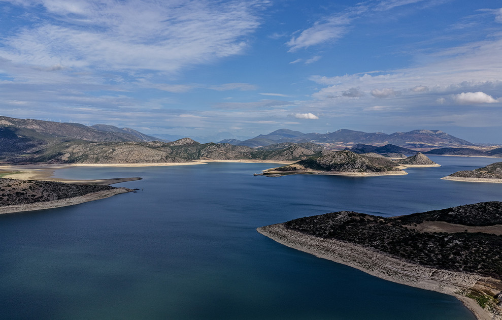 Φωτογραφίες που καταγράφηκαν από drone αποτυπώνουν με εντυπωσιακό αλλά και ανησυχητικό τρόπο το μέγεθος του προβλήματος. Η στάθμη της λίμνης έχει υποχωρήσει τόσο, ώστε να αποκαλύπτεται ακόμη και το μικρό νησάκι το οποίο συνήθως παραμένει καλυμμένο από τα νερά. Η εικόνα αυτή καταδεικνύει το εύρος της λειψυδρίας που πλήττει τη χώρα.